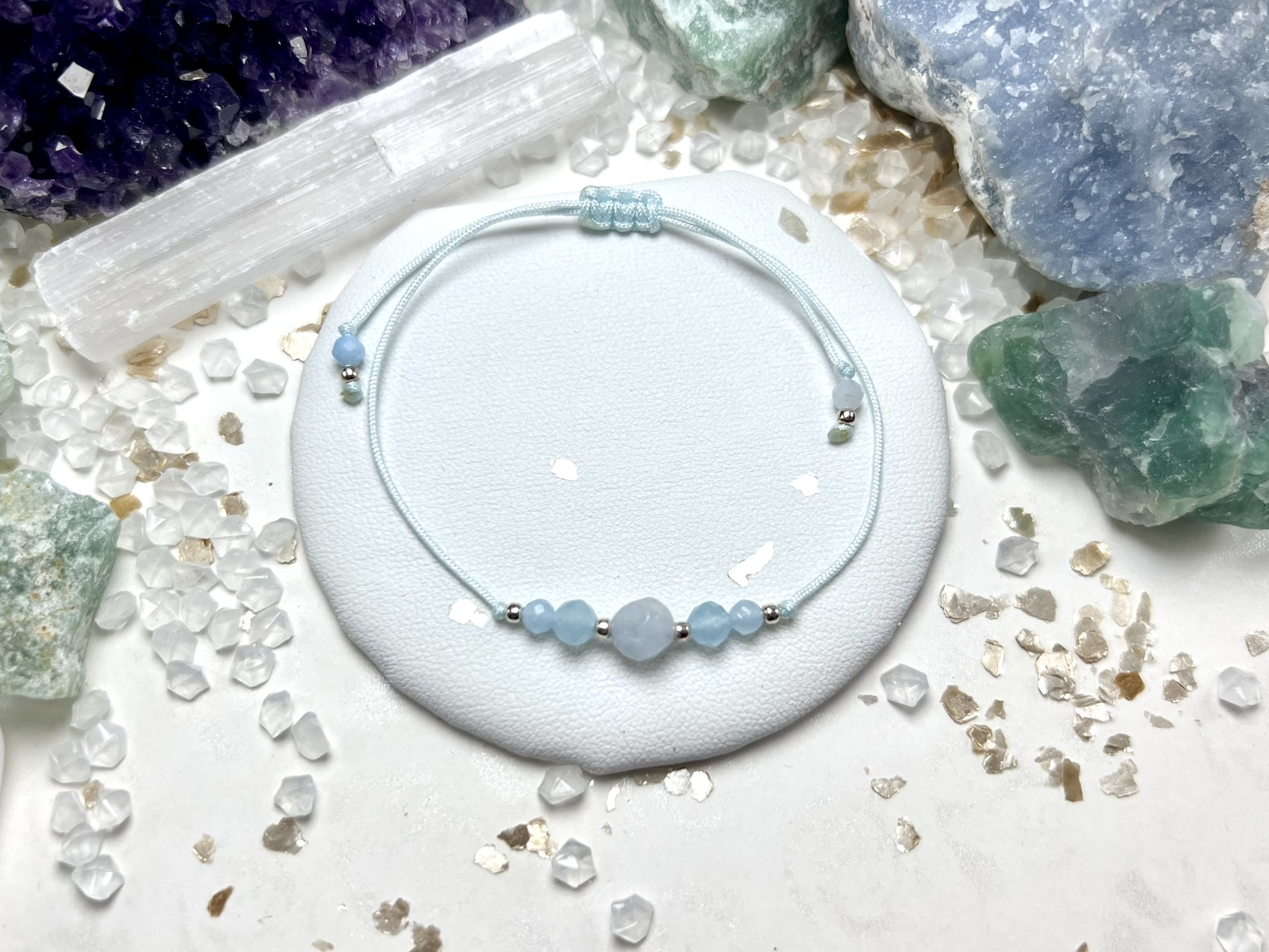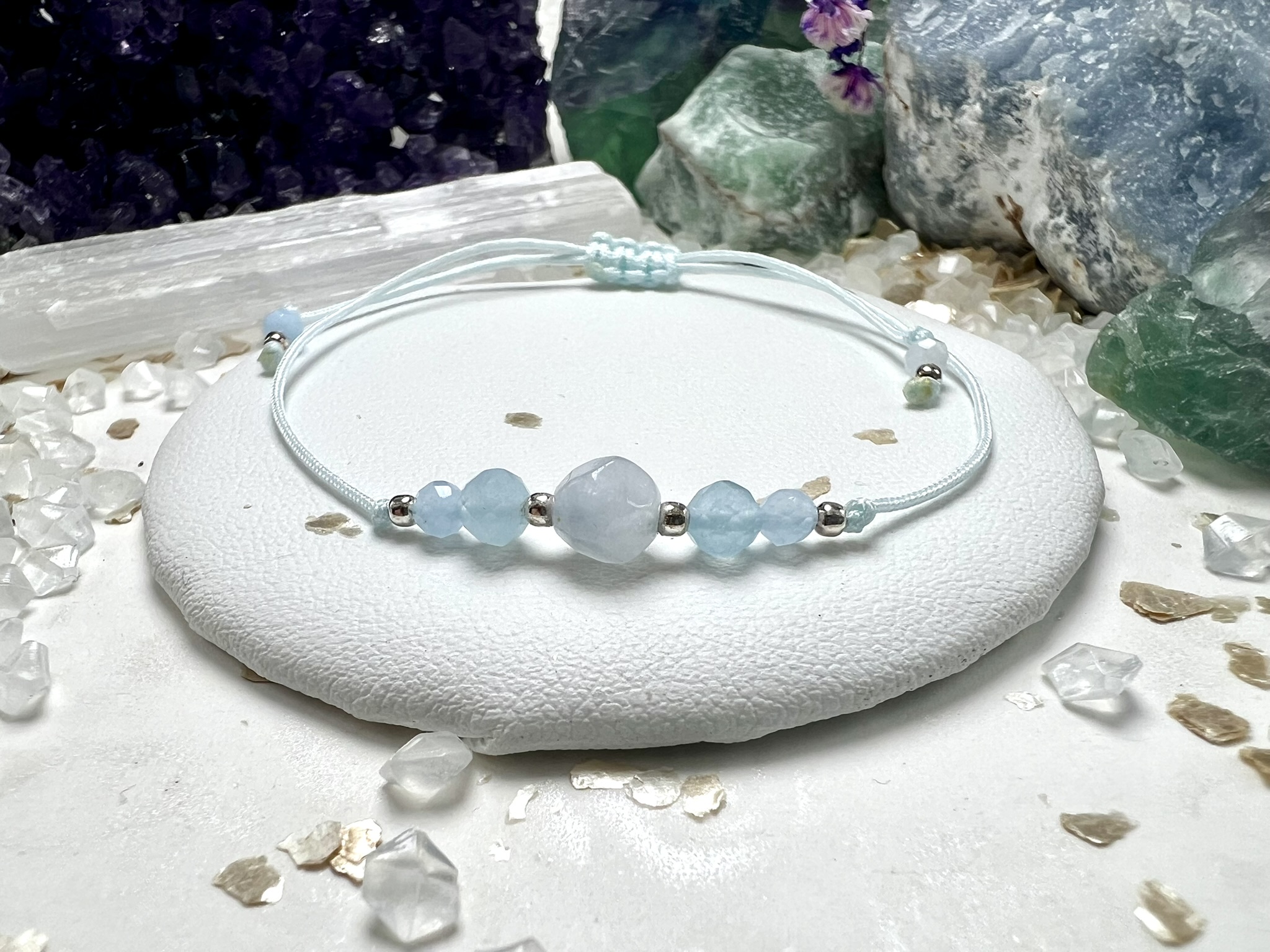 Bransoletka rezonuje z **Czakrą Gardła**, wspierając wyrażanie siebie i spokojny przepływ emocji.