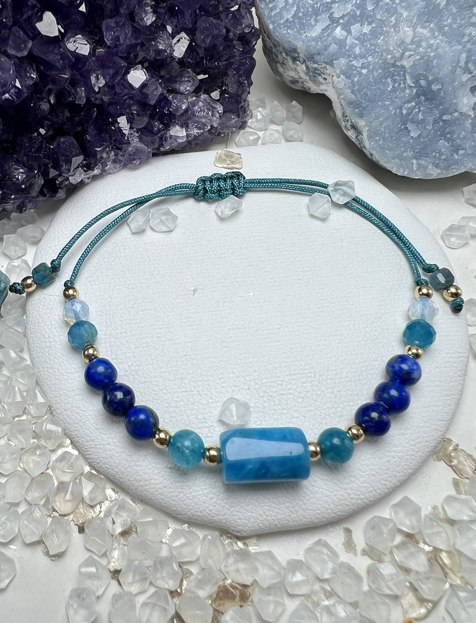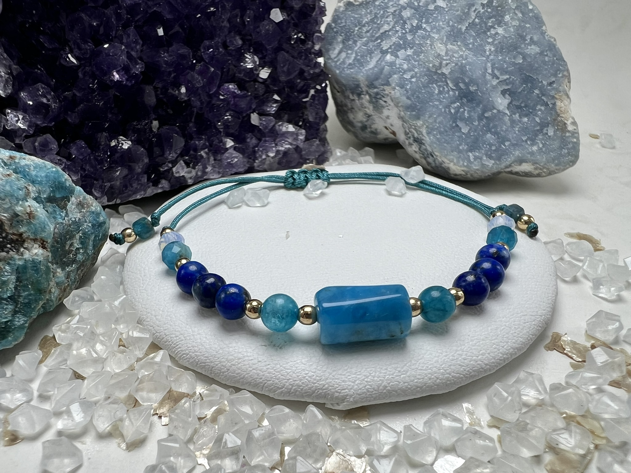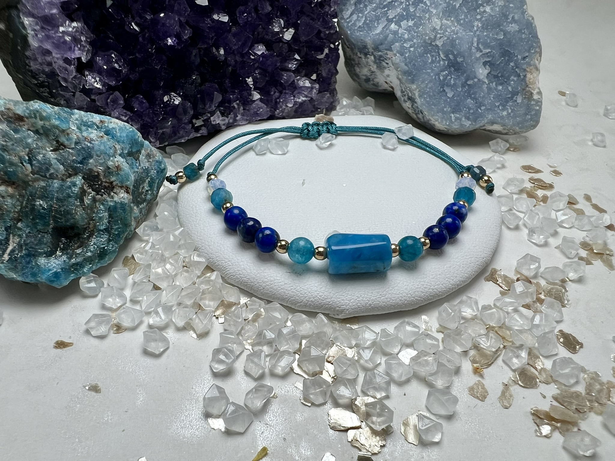 Bransoletka z Apatytu, Lapis Lazuli i Opalu z cylindrycznym kamieniem – wspiera wewnętrzną mądrość, komunikację i twórczy przepływ.
