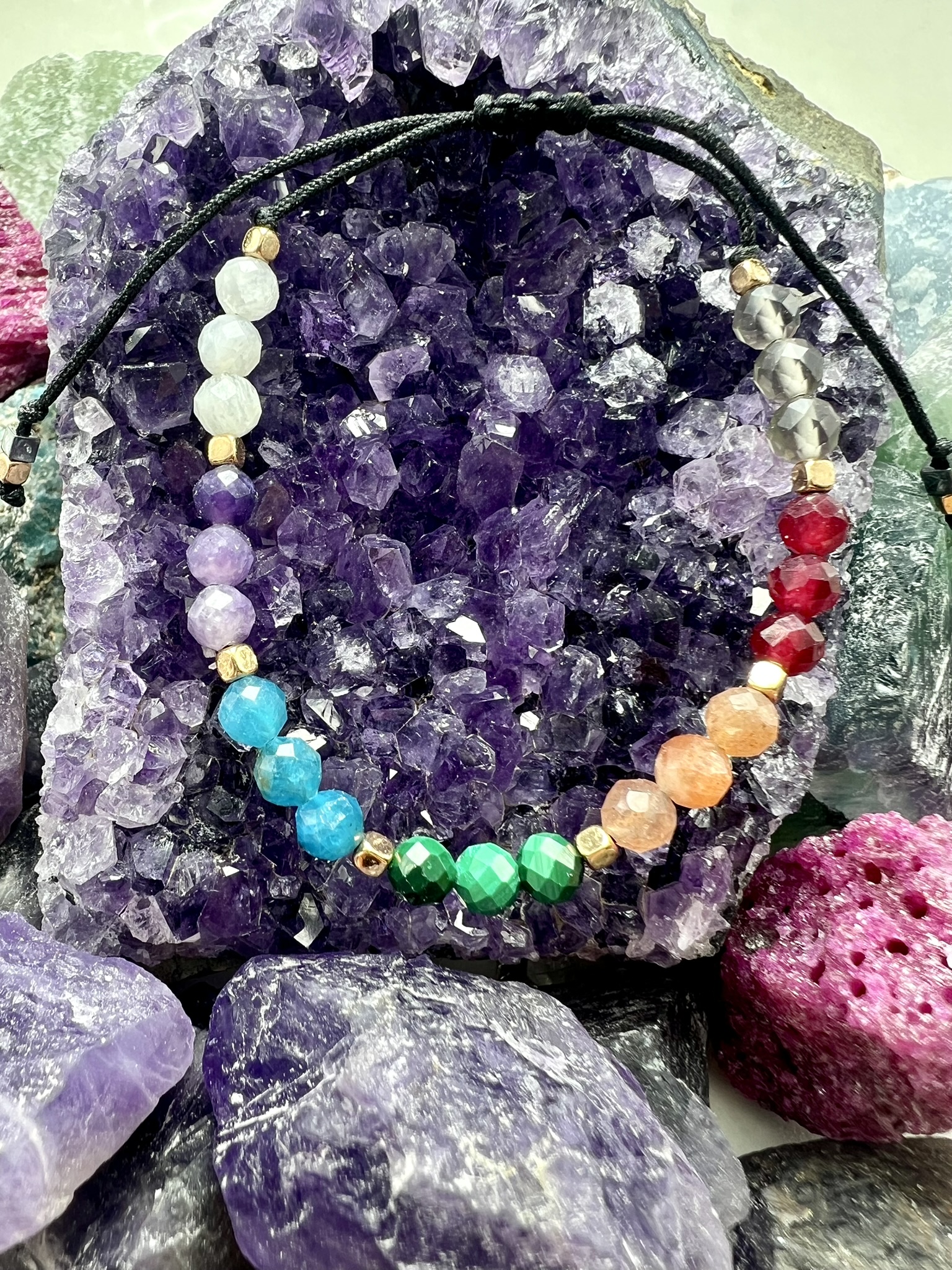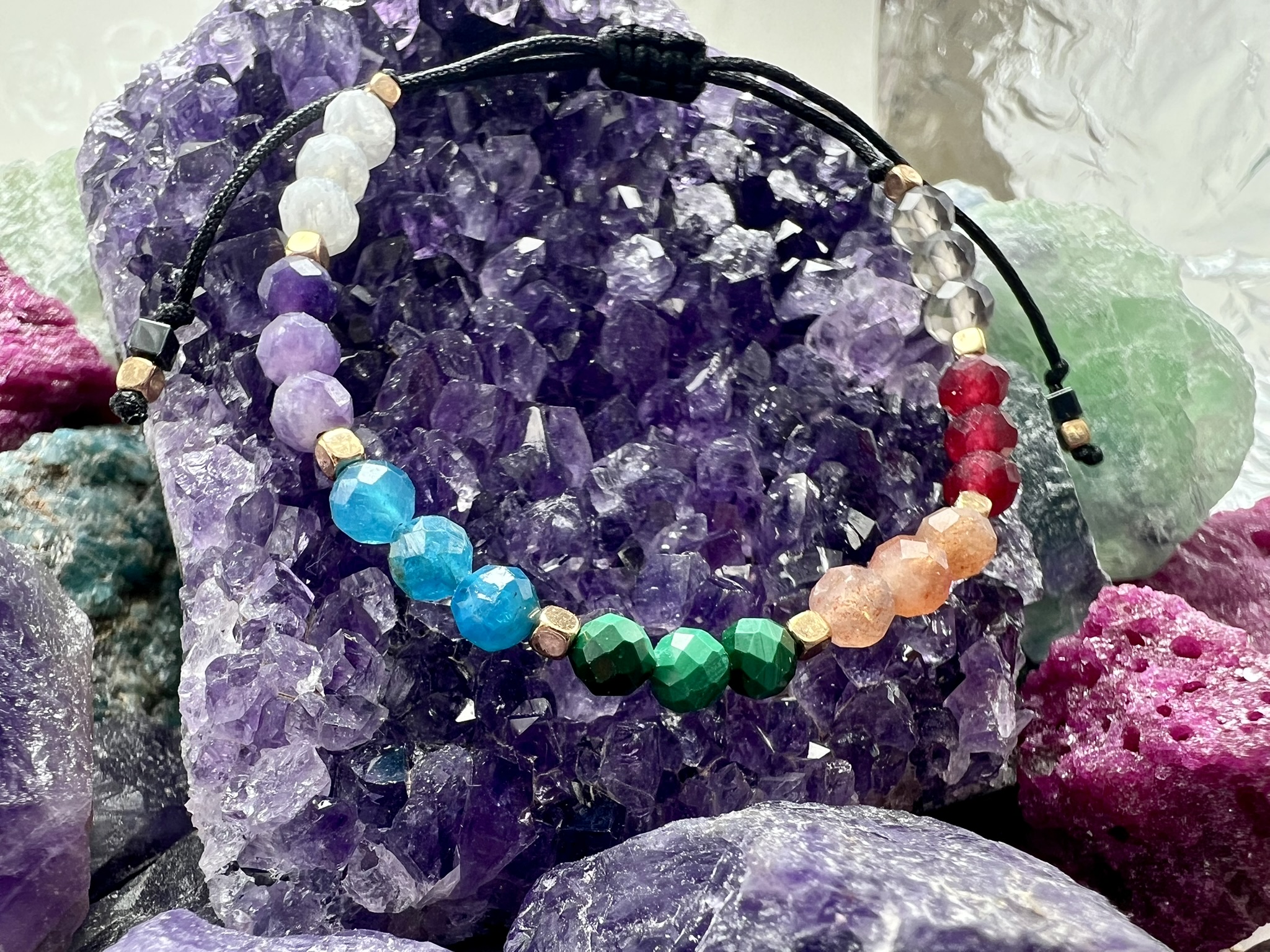 Bransoletka rezonuje z wszystkimi **siedmioma czakrami**, wspierając przepływ energii i transformację.