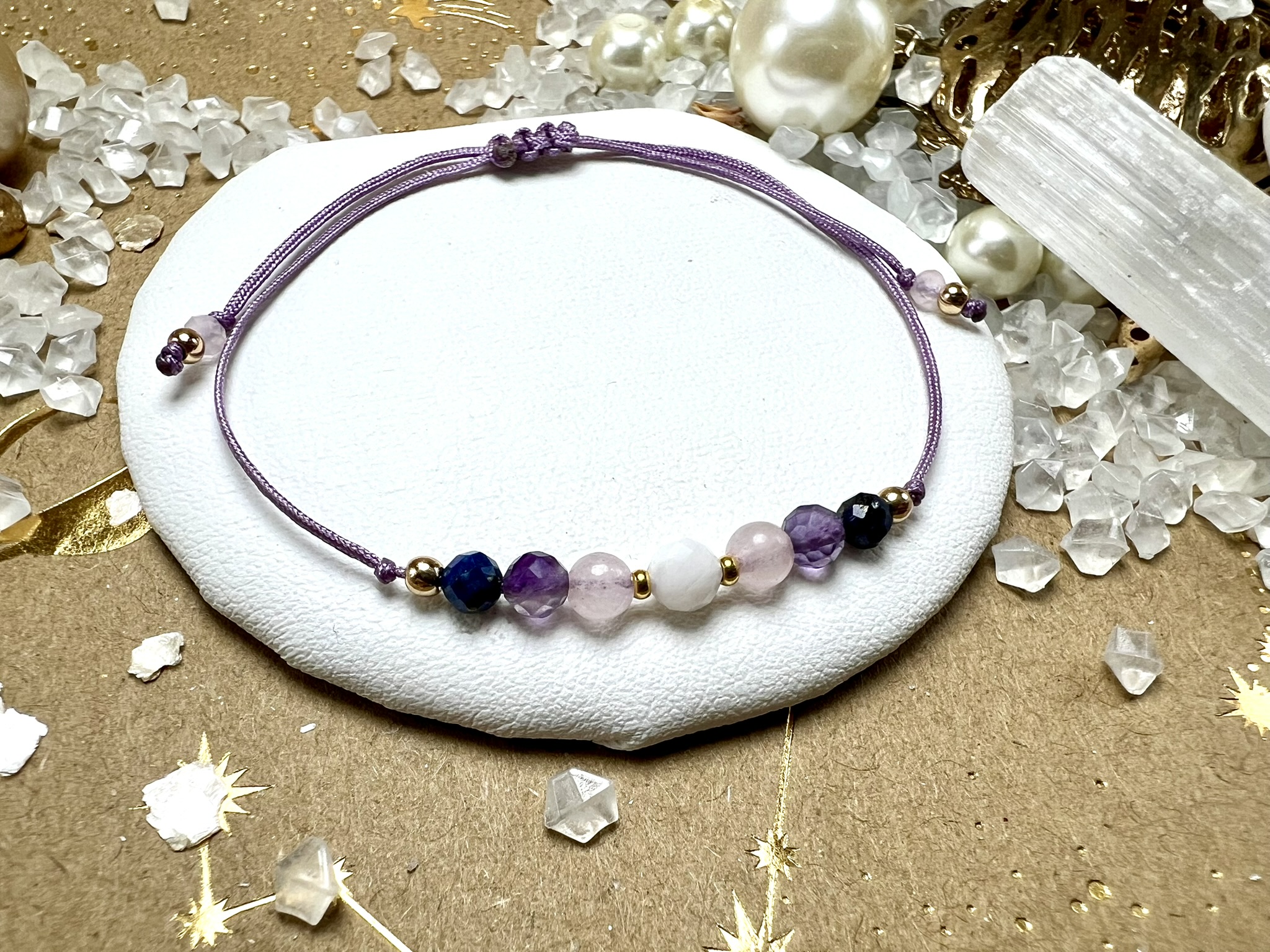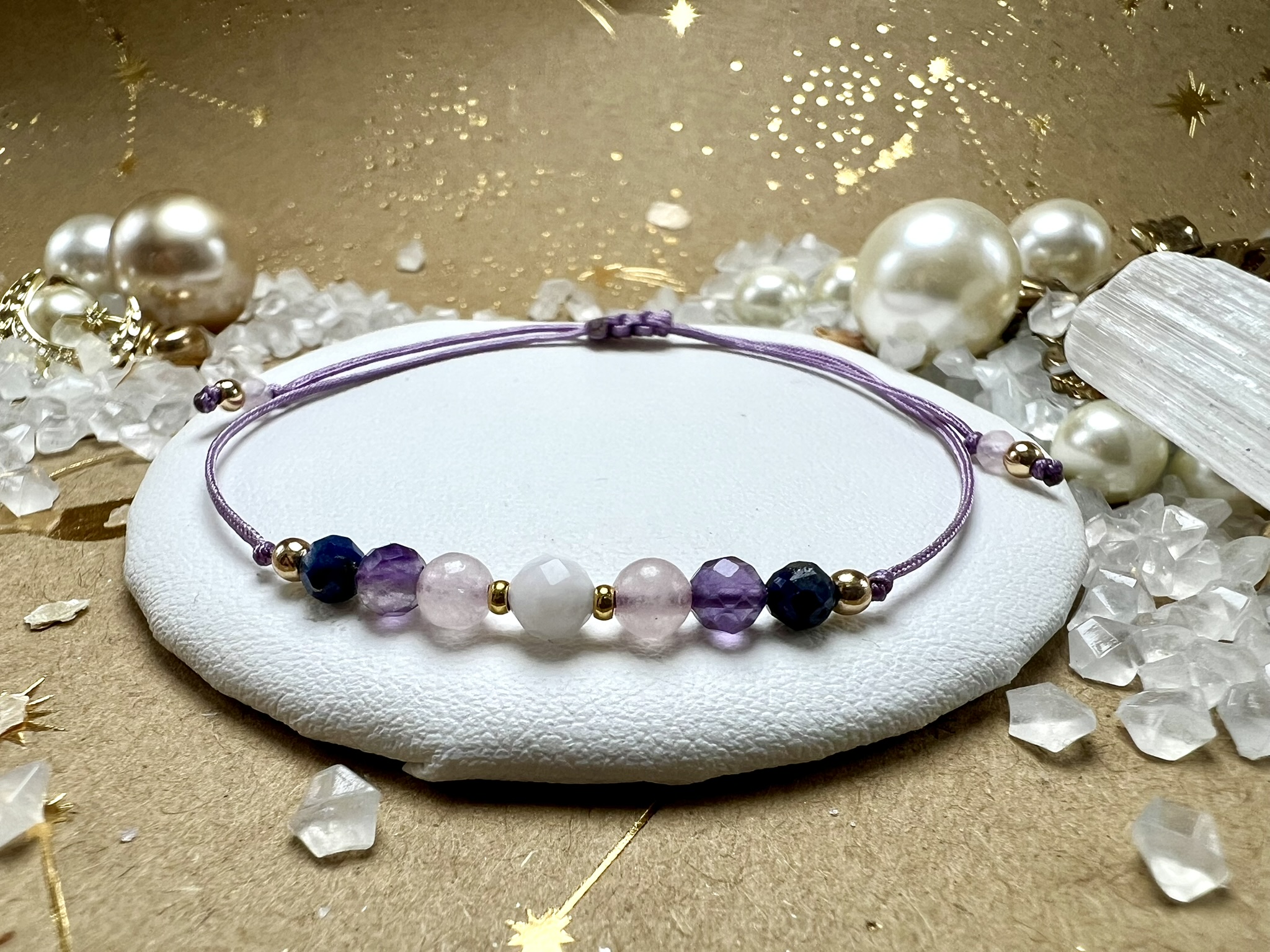 Bransoletka z Kamienia Księżycowego, Kwarcu Różowego, Fluorytu Fioletowego i Lapis Lazuli – wspiera równowagę, miłość i wewnętrzny spokój.