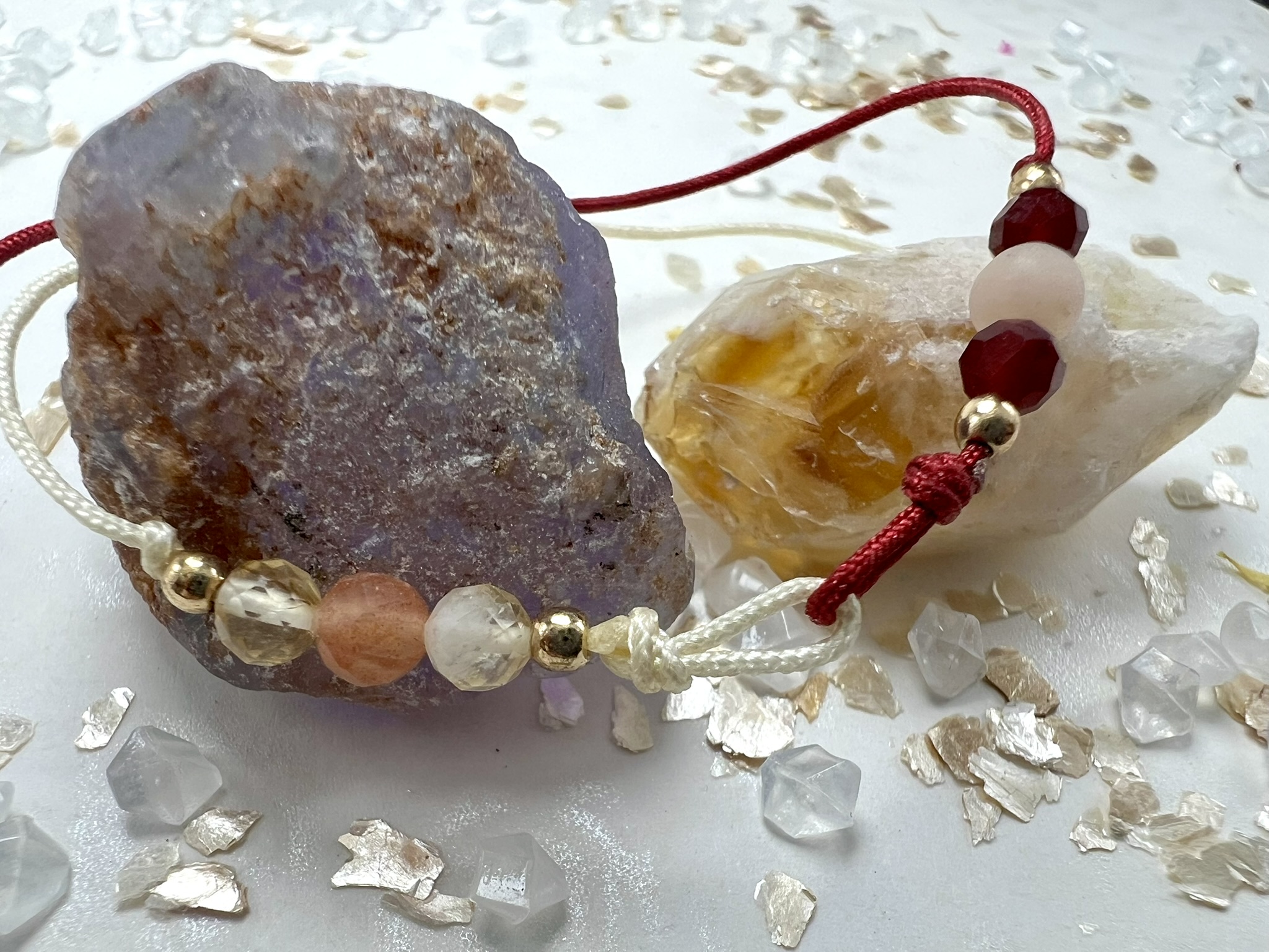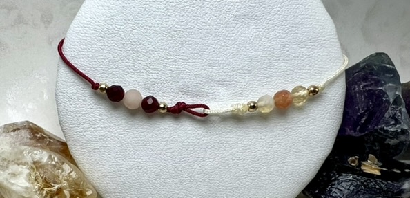 Dwukolorowa bransoletka z Kamienia Słonecznego, Cytrynu, Awenturynu Brzoskwiniowego i Karneolu – połączenie optymizmu, pasji i twórczej energii. Wspiera kreatywność, pewność siebie i odwagę w realizacji marzeń.