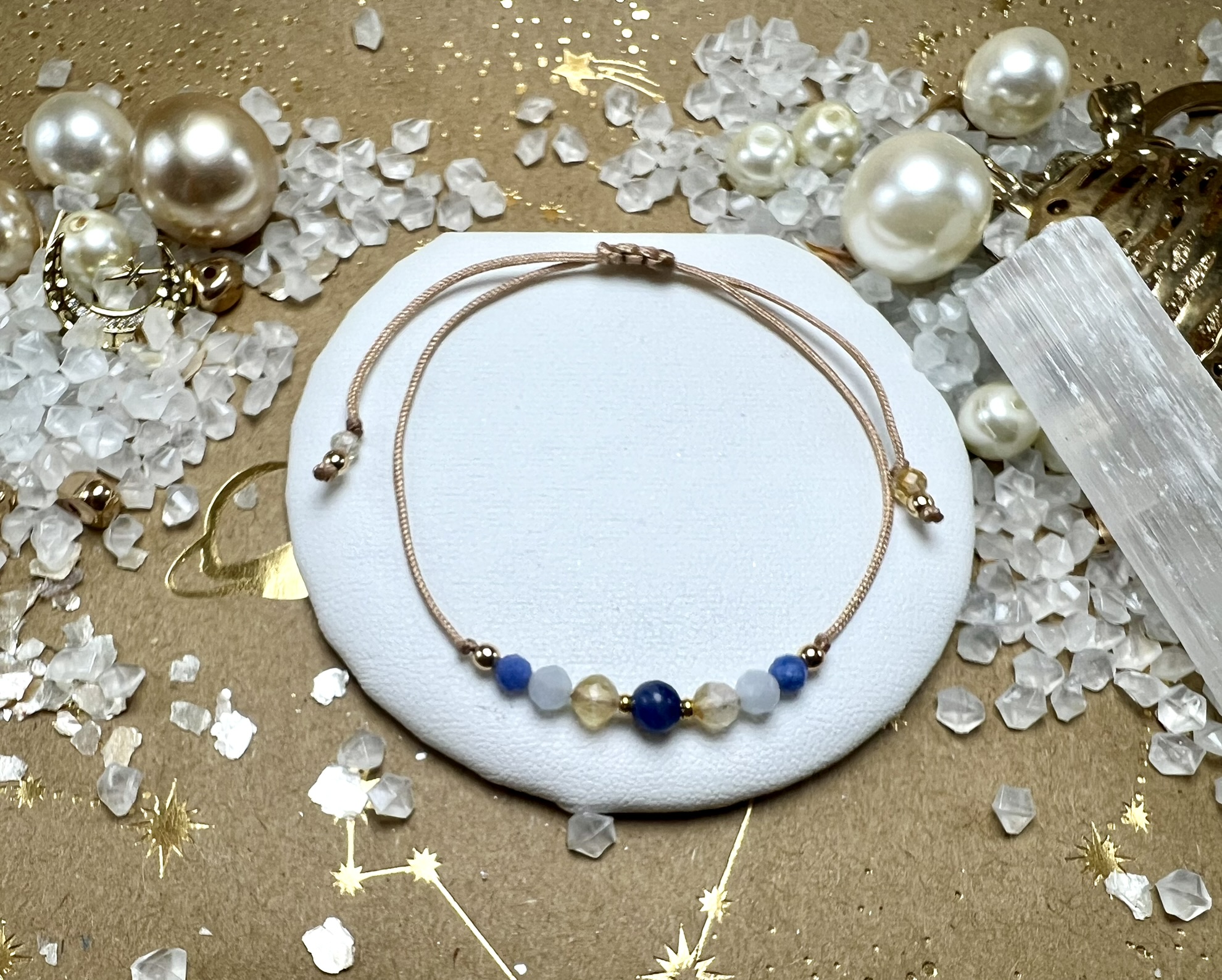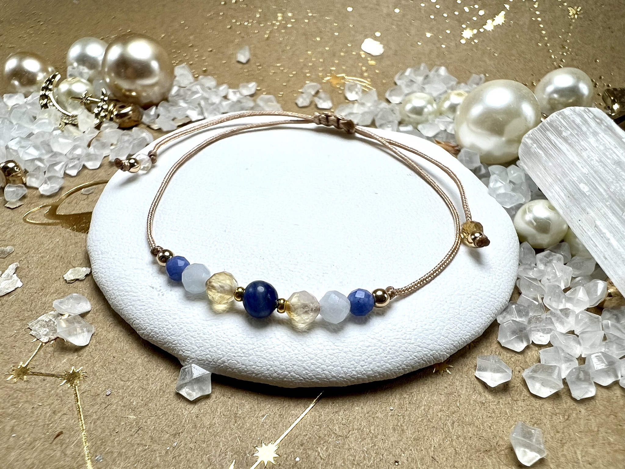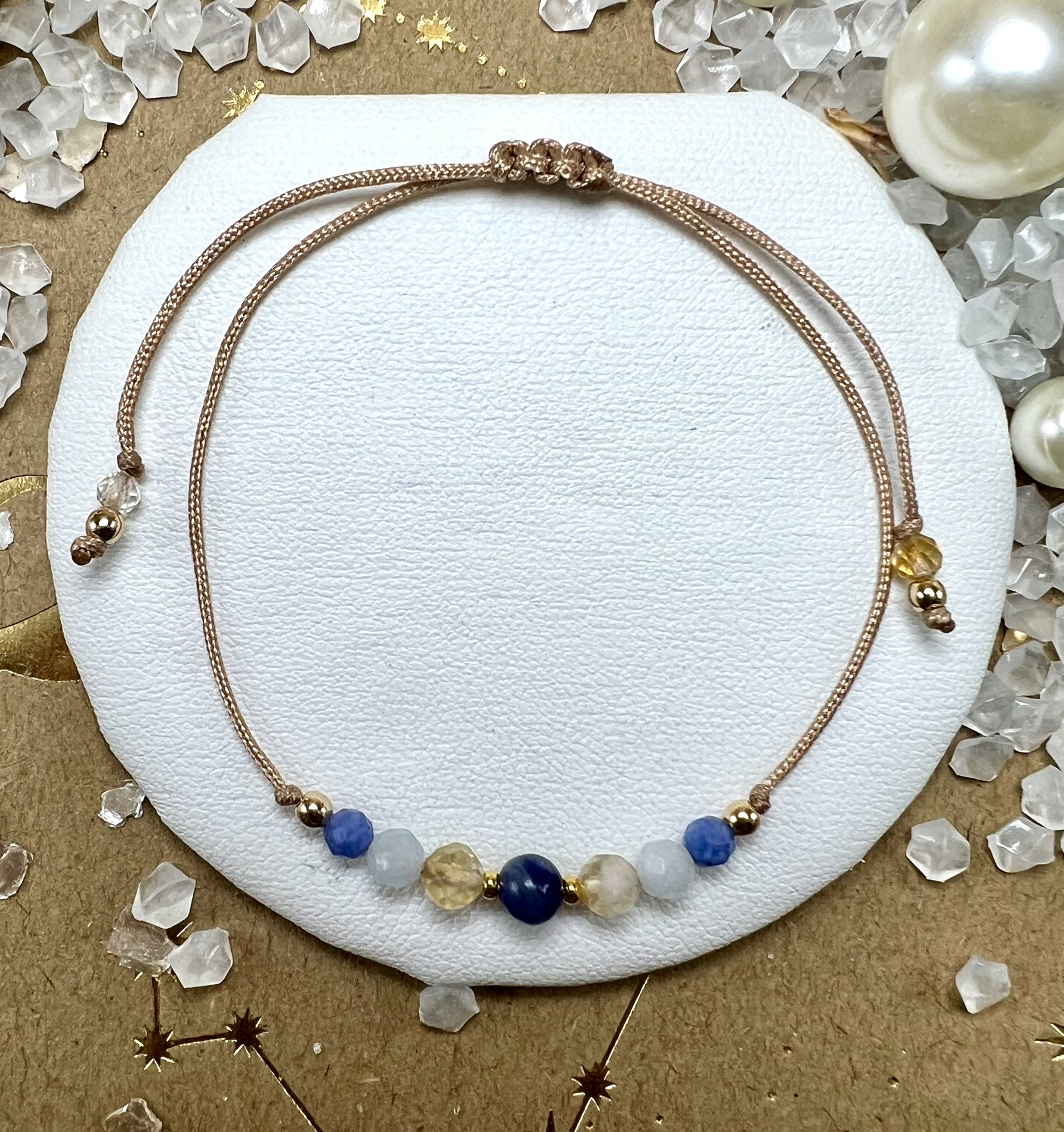 Bransoletka z Sodalitu, Cytrynu, Akwamarynu i Chalcedonu Niebieskiego – wspiera komunikację, lekkość myśli i wewnętrzną harmonię.