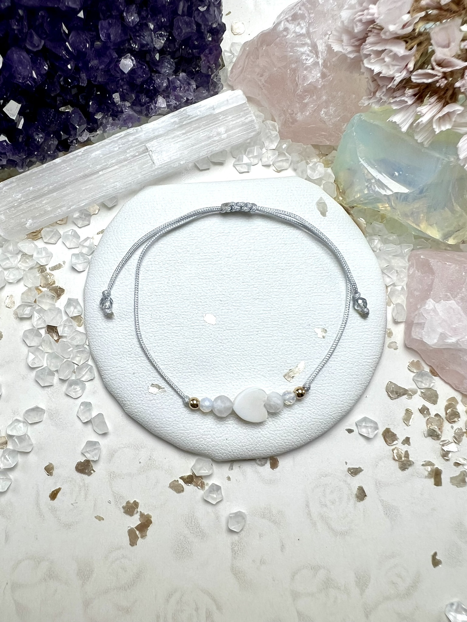 Srebrne przekładki z hematytu dopełniają jej blask ochronną energią, a **jasnoszary sznurek** symbolizuje subtelność, ciszę i wewnętrzny balans.