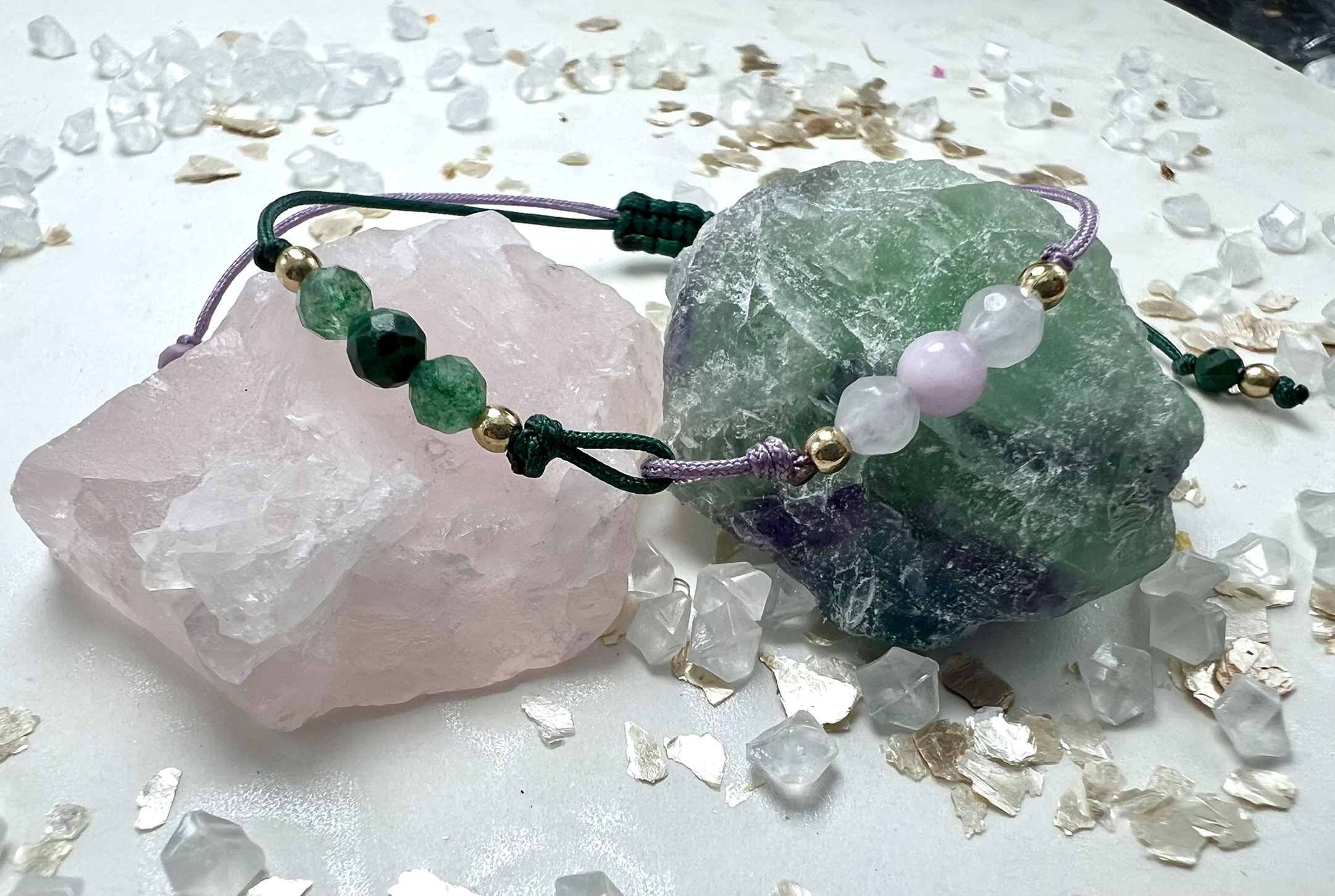 Dwukolorowa bransoletka z Kunzytu, Kwarcu Różowego, Malachitu, Awenturynu Zielonego i Fosfosyderytu – połączenie miłości, harmonii i dobrobytu. Wspiera relacje oparte na równowadze oraz przyciąga obfitość płynącą z serca.