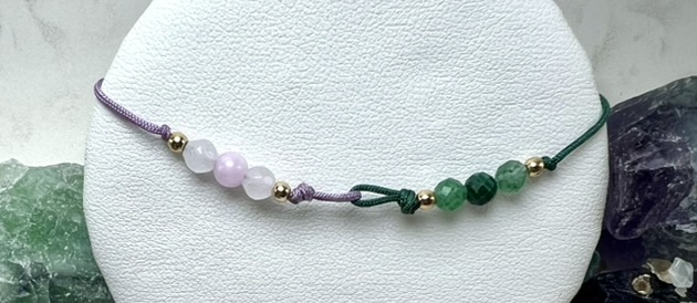 **Wrzosowy i ciemnozielony sznurek** łączą energię serca i ziemi: romantyczną czułość z przyziemną harmonią.