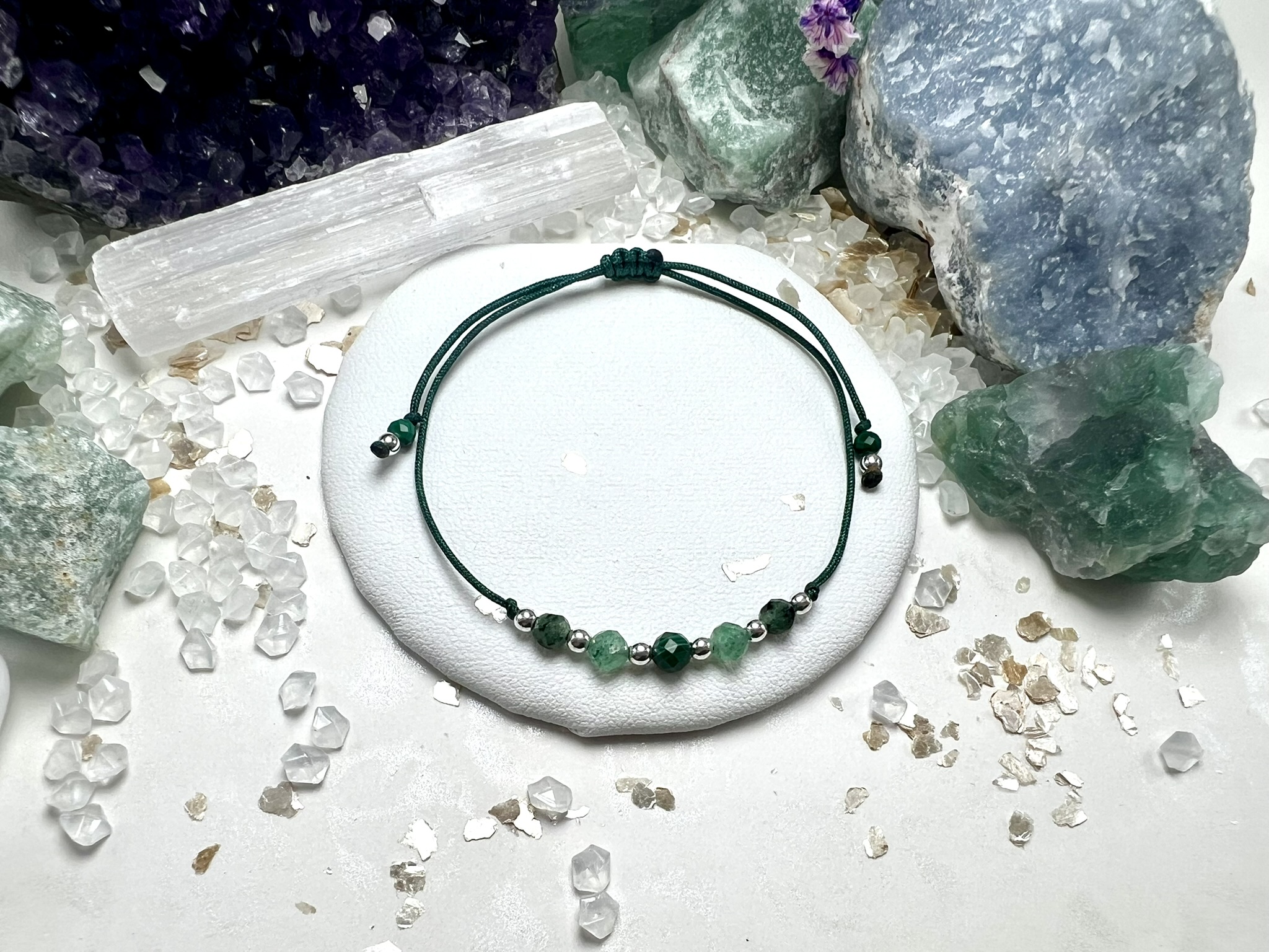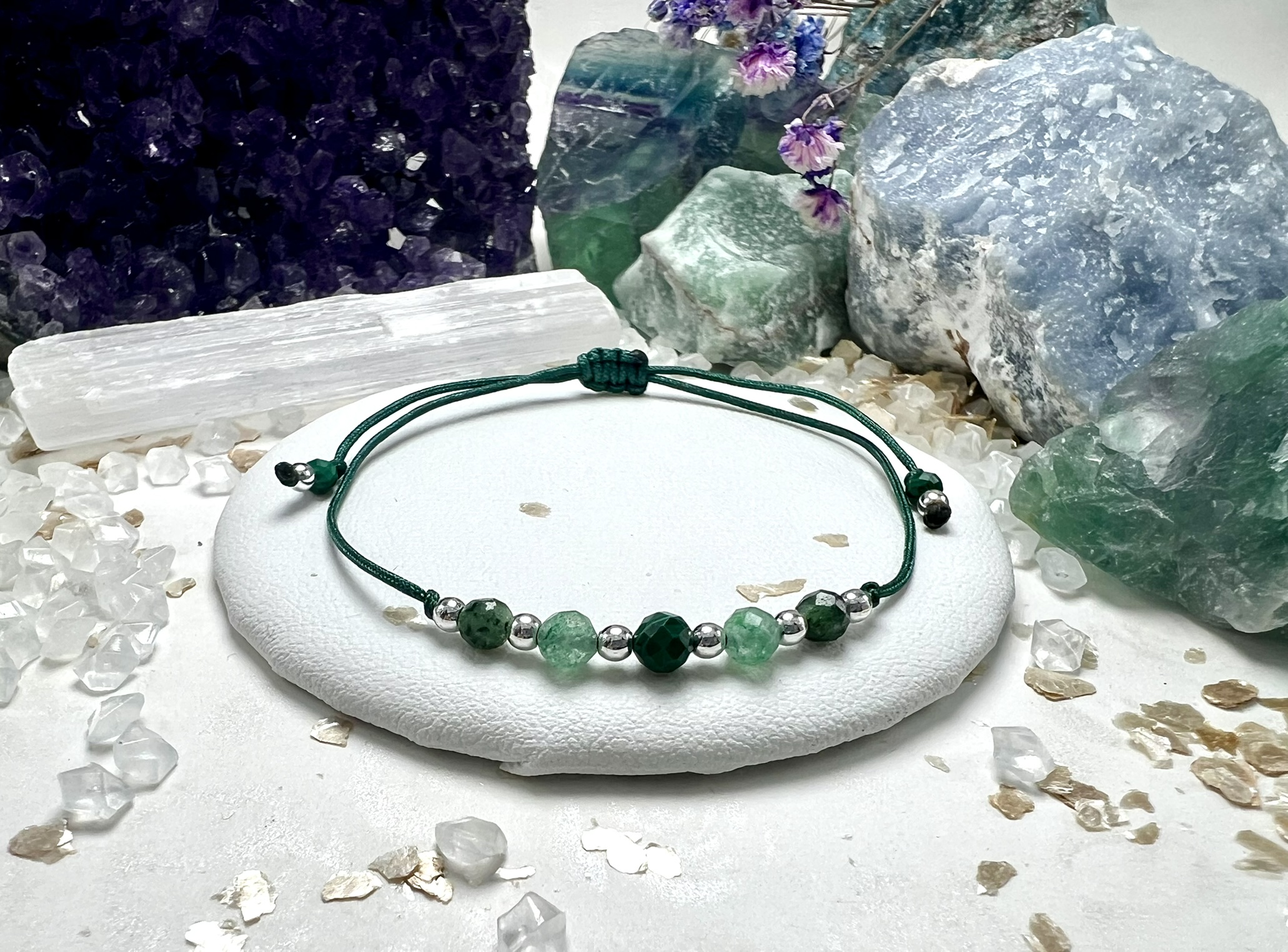 Zieleń kamieni symbolizuje wzrost, uzdrowienie i materialne bezpieczeństwo. To bransoletka dla tych, którzy chcą przyciągnąć sukces z zachowaniem równowagi serca.