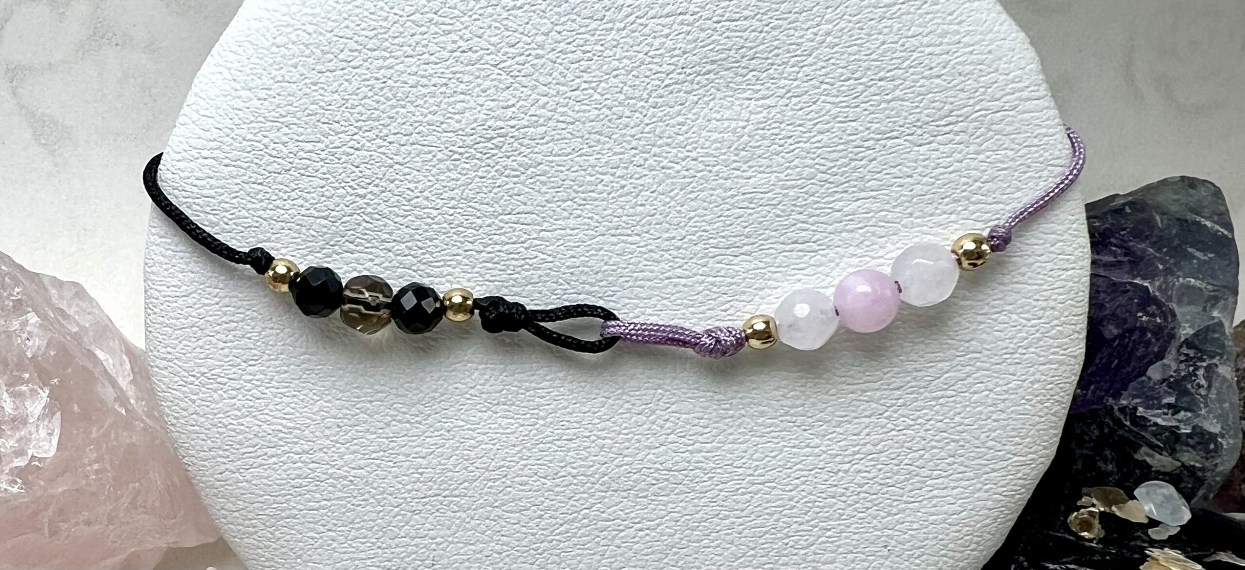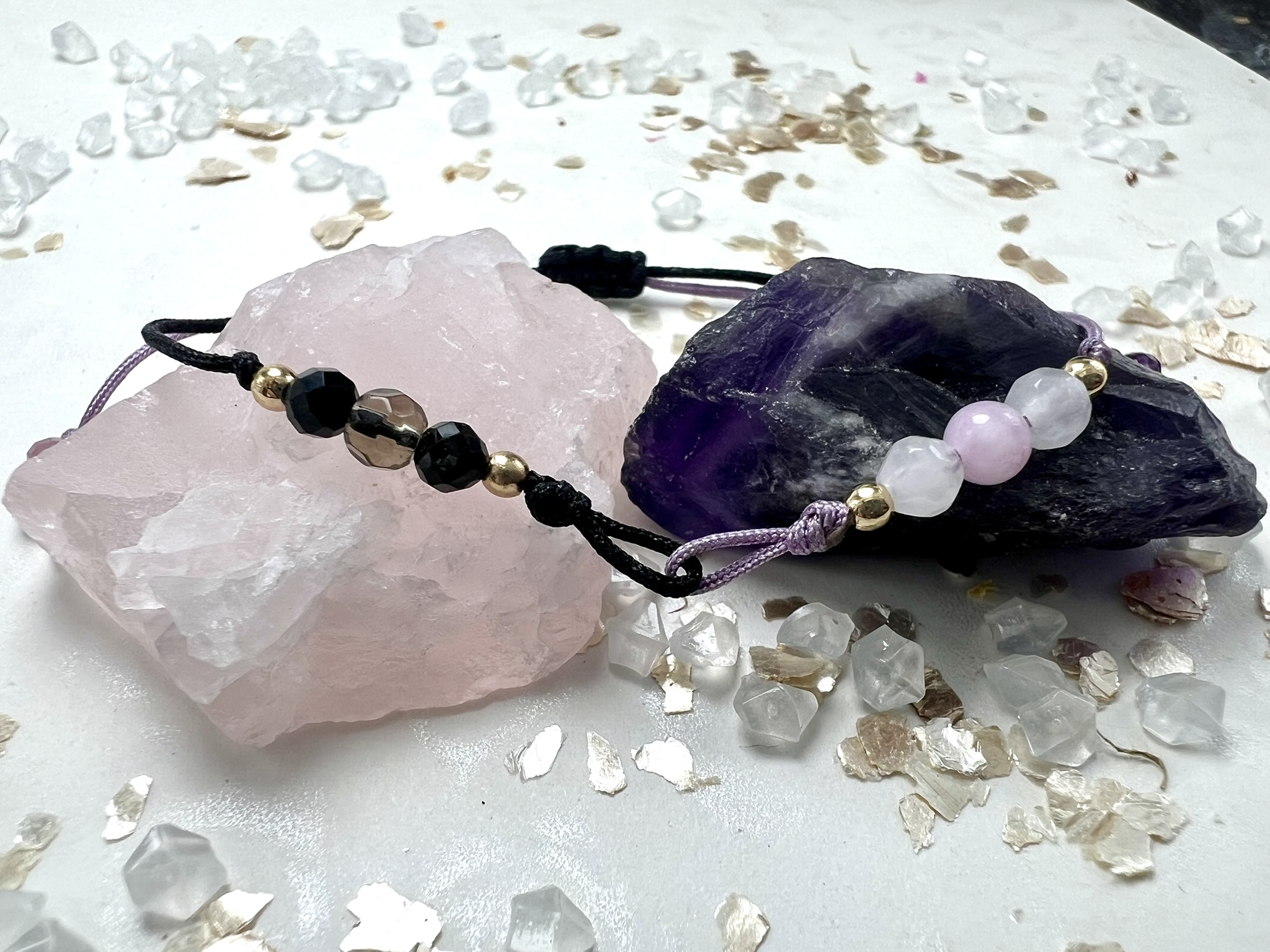 Dwukolorowa bransoletka z Kwarcu Dymnego, Turmalinu Czarnym, Kunzytu, Kwarcu Różowego, Ametystu i Fosfosyderytu – połączenie ochrony, czułości i duchowej równowagi. Wspiera relacje pełne zaufania i spokoju.