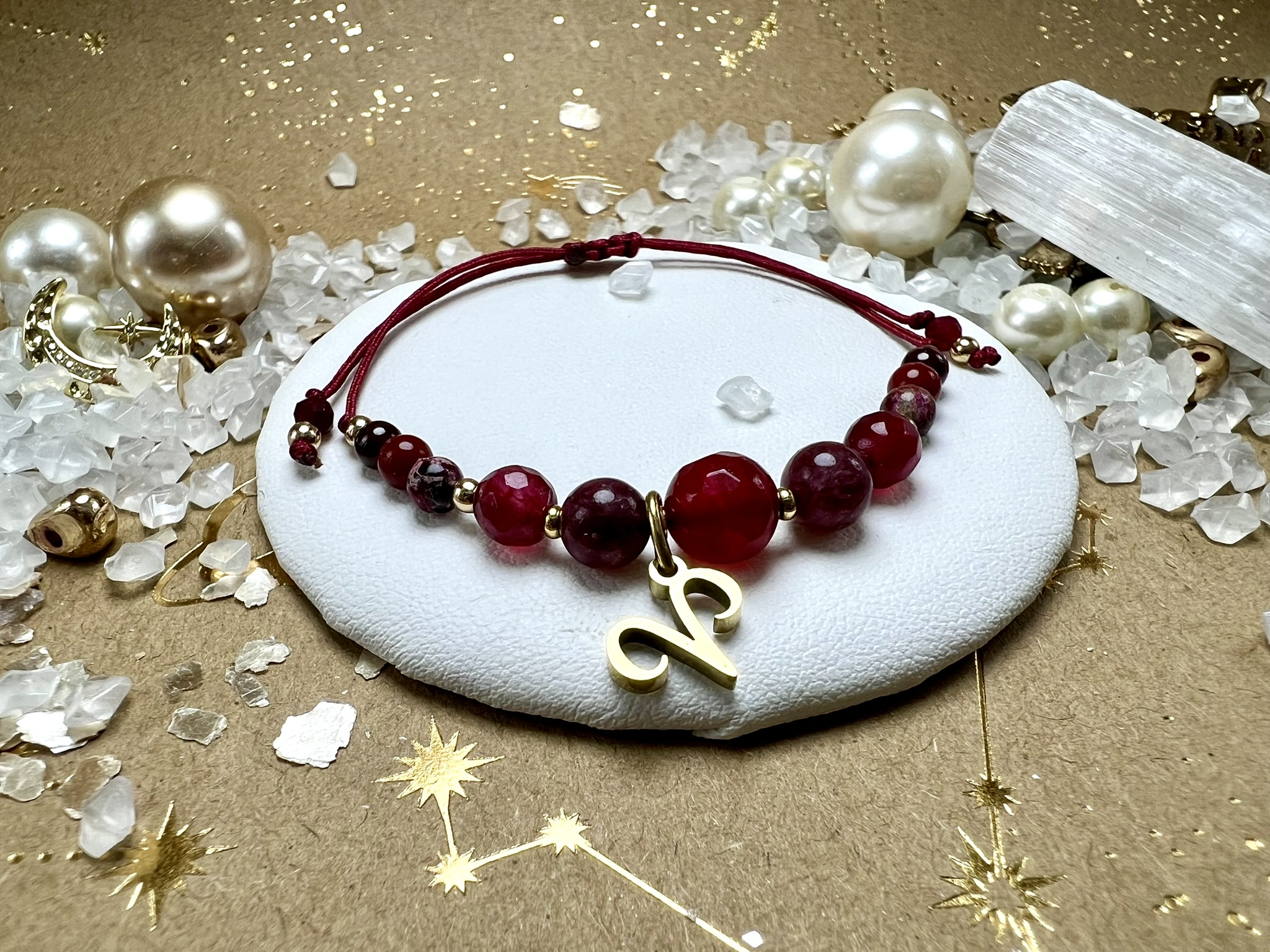 Złote przekładki z Hematytu dodają elegancji i równowagi, a bordowy sznureczek symbolizuje ogień, determinację i wytrwałość.