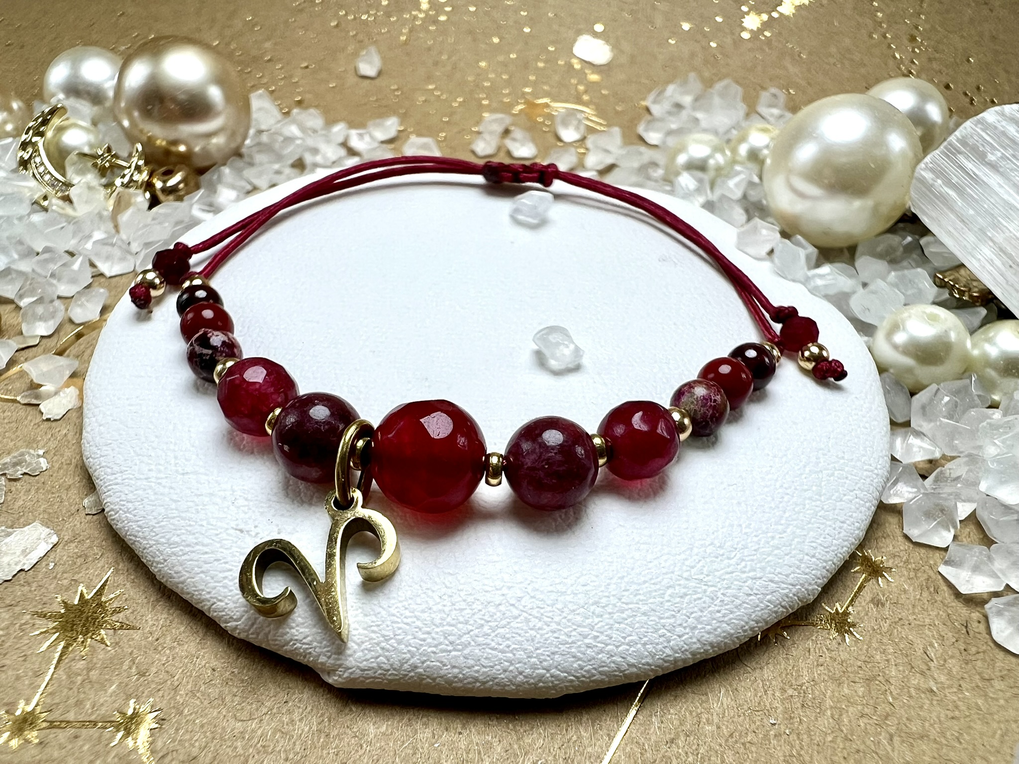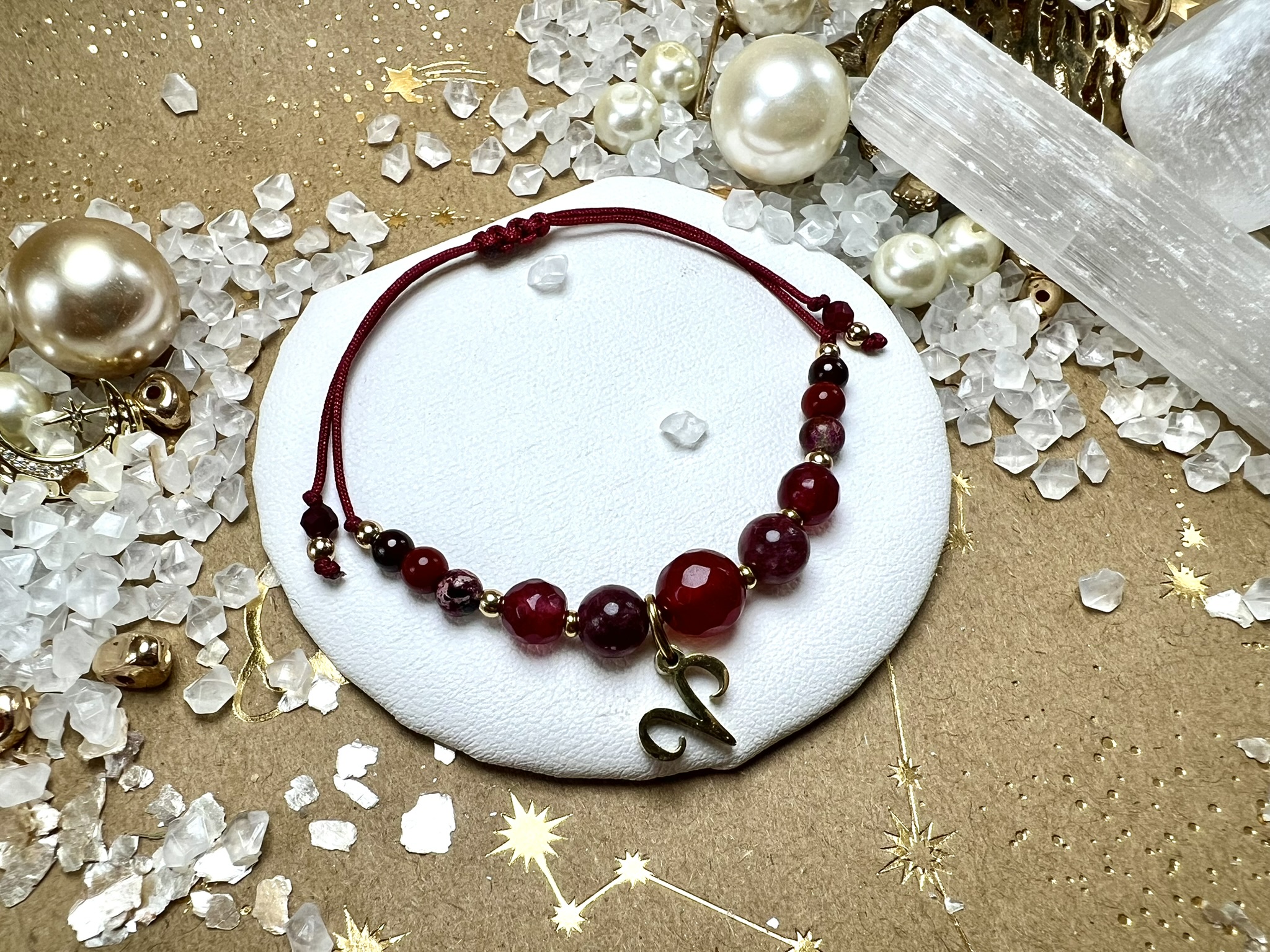 Bransoletka została zwieńczona pozłacaną zawieszką ze znakiem zodiaku Barana, podkreślając jej silny, ognisty charakter.