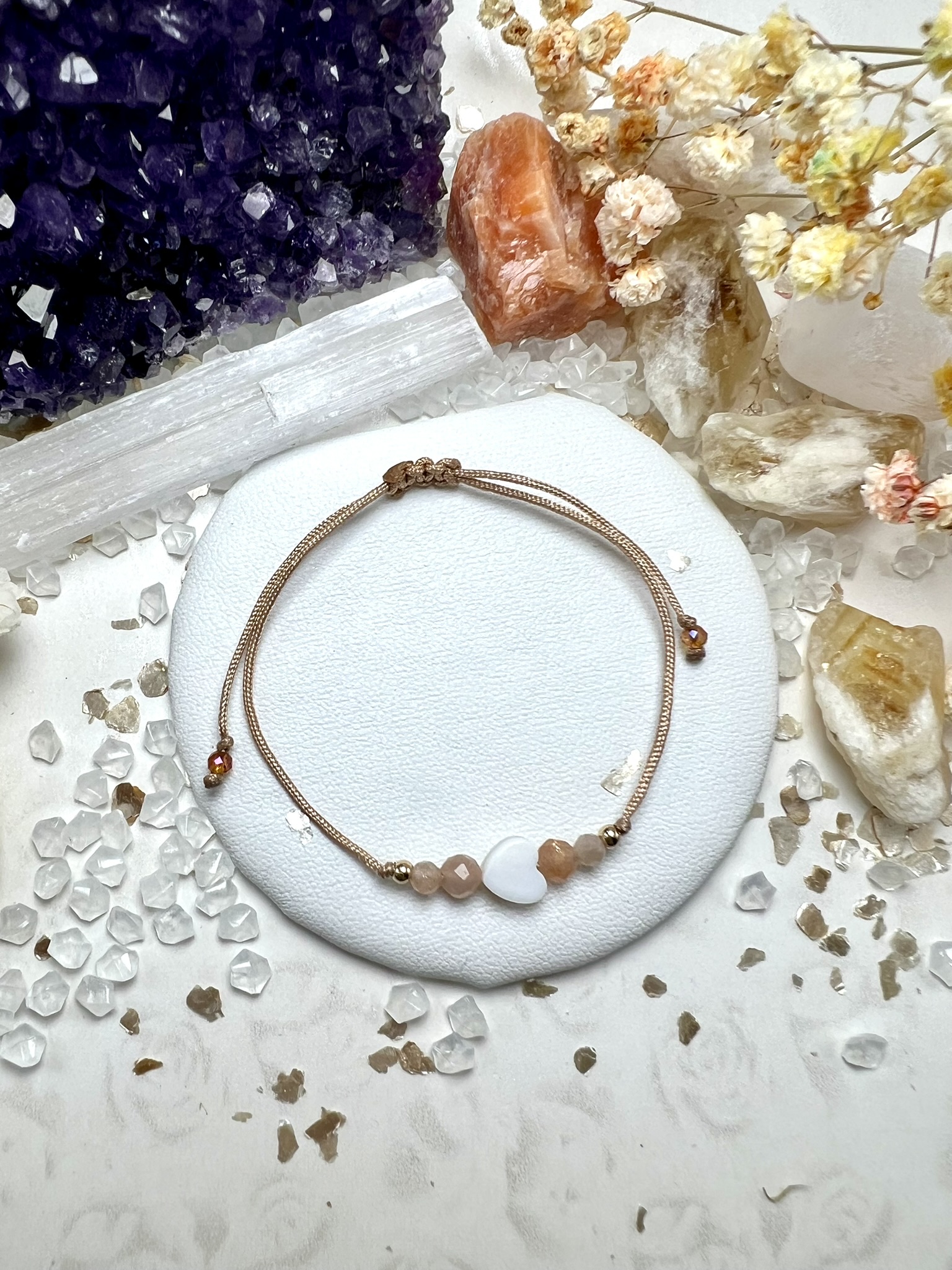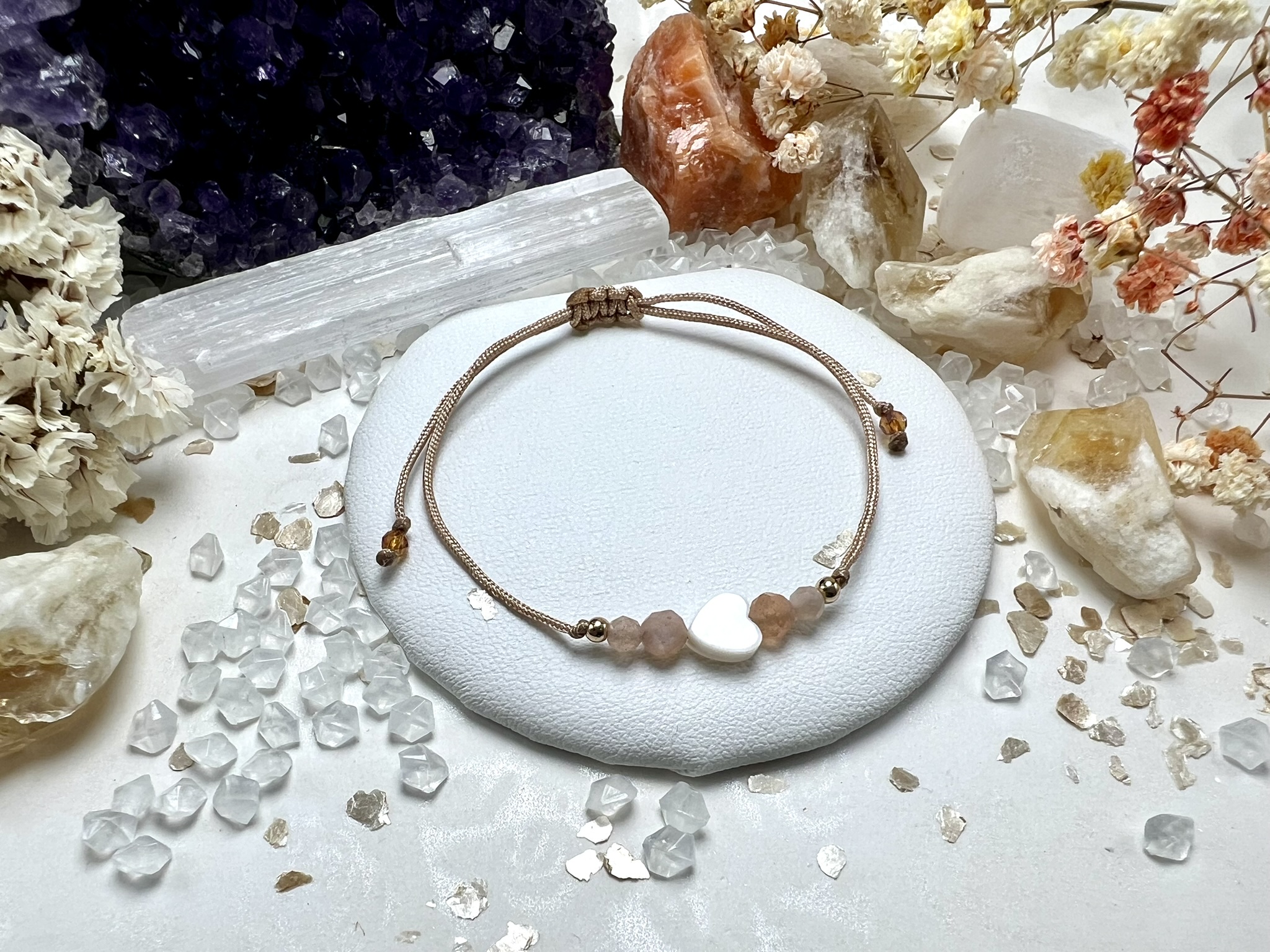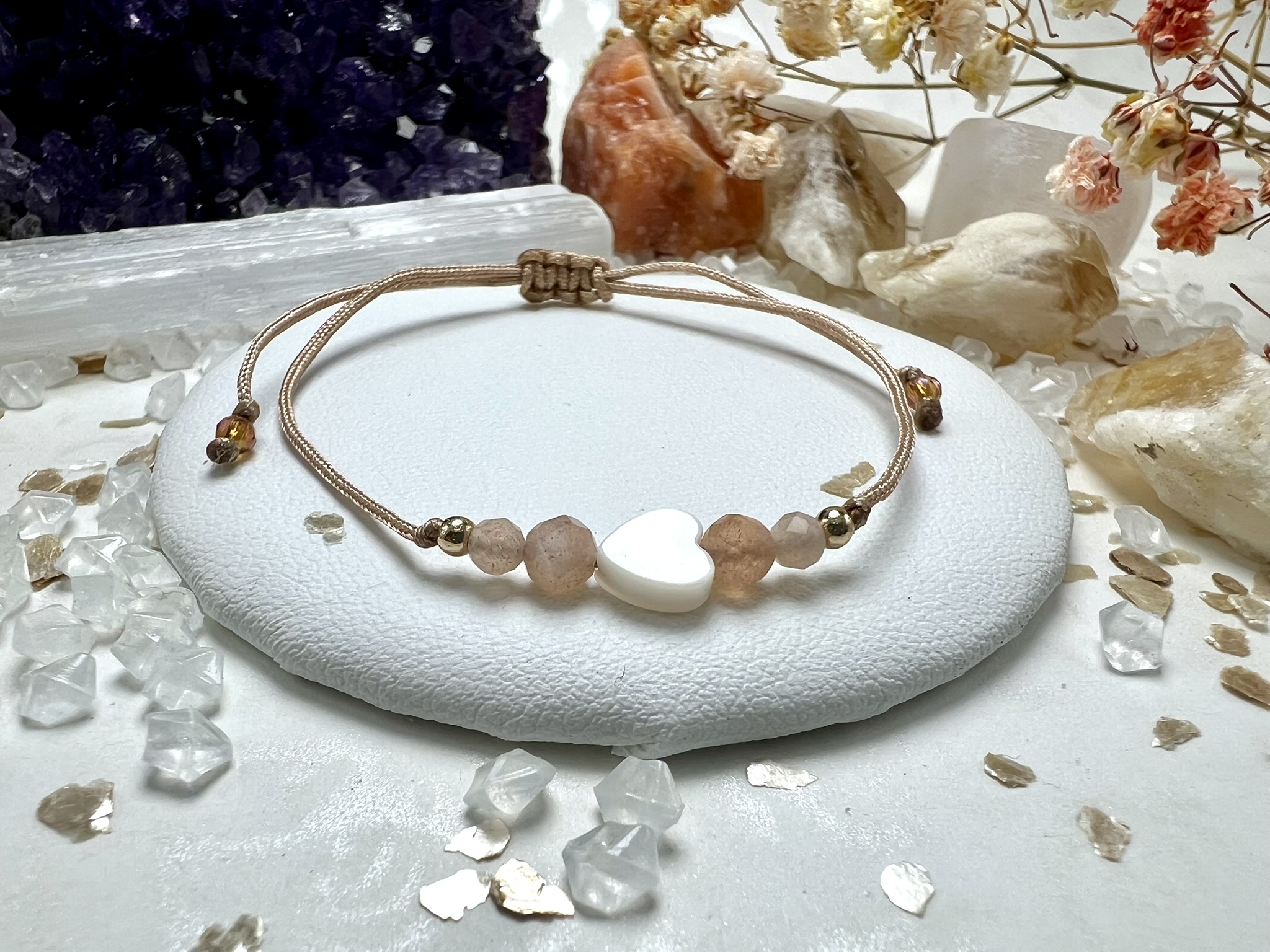 Talizman pewności siebie i radości życia – kamień słoneczny, masa perłowa i kwarc splecione w kompozycję ciepła, światła i wdzięczności.