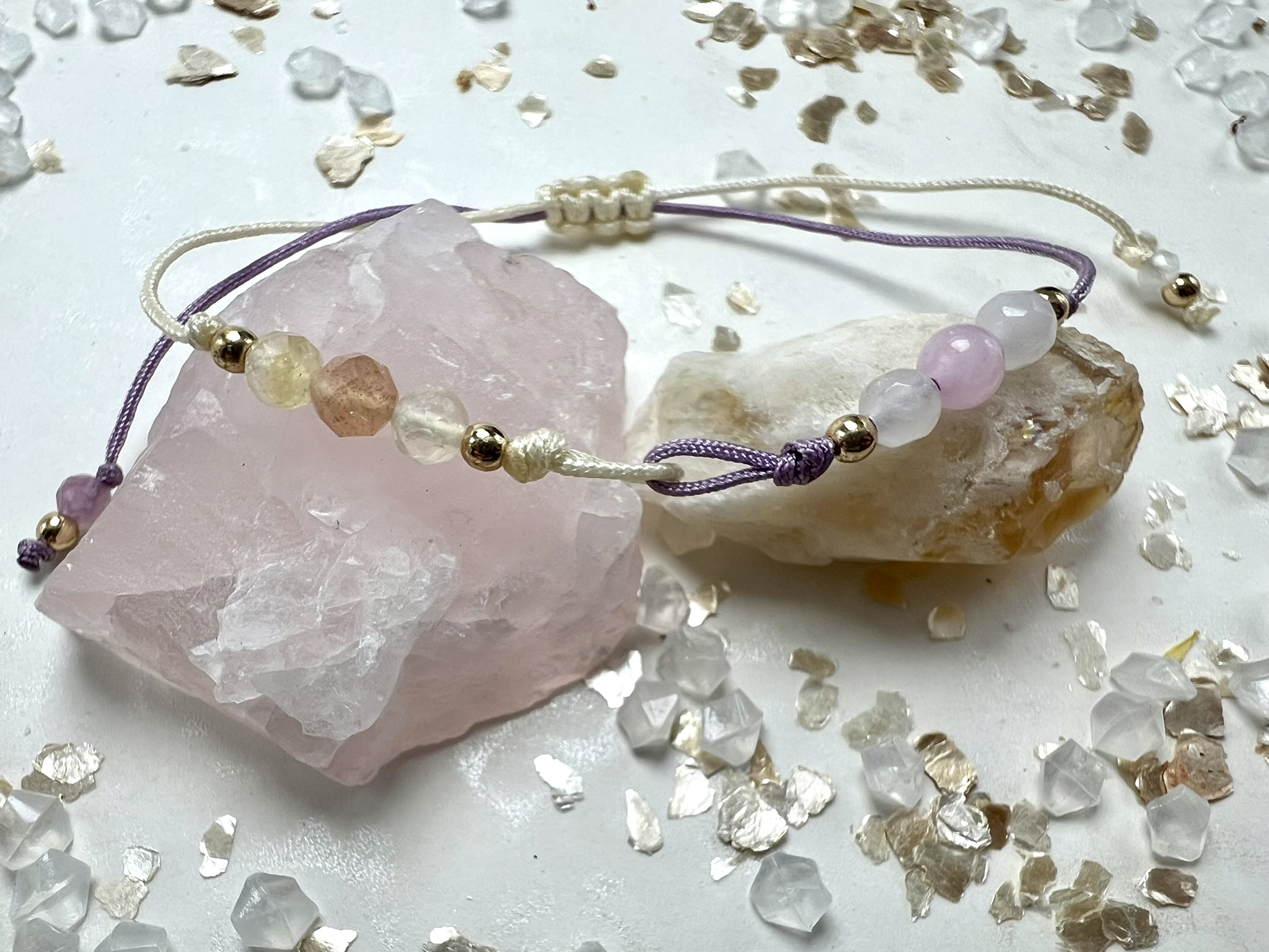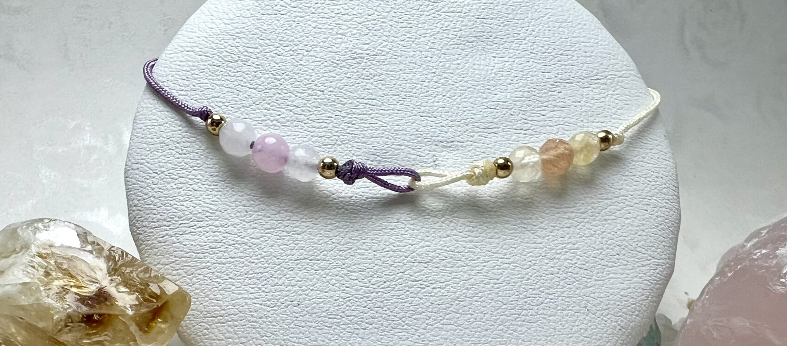 Dwukolorowa bransoletka z Kamienia Słonecznego, Cytrynu, Kunzytu, Kwarcu Różowego i Fosfosyderytu – połączenie radości, czułości i wdzięczności. Wspiera szczęście, harmonię i otwartość serca.