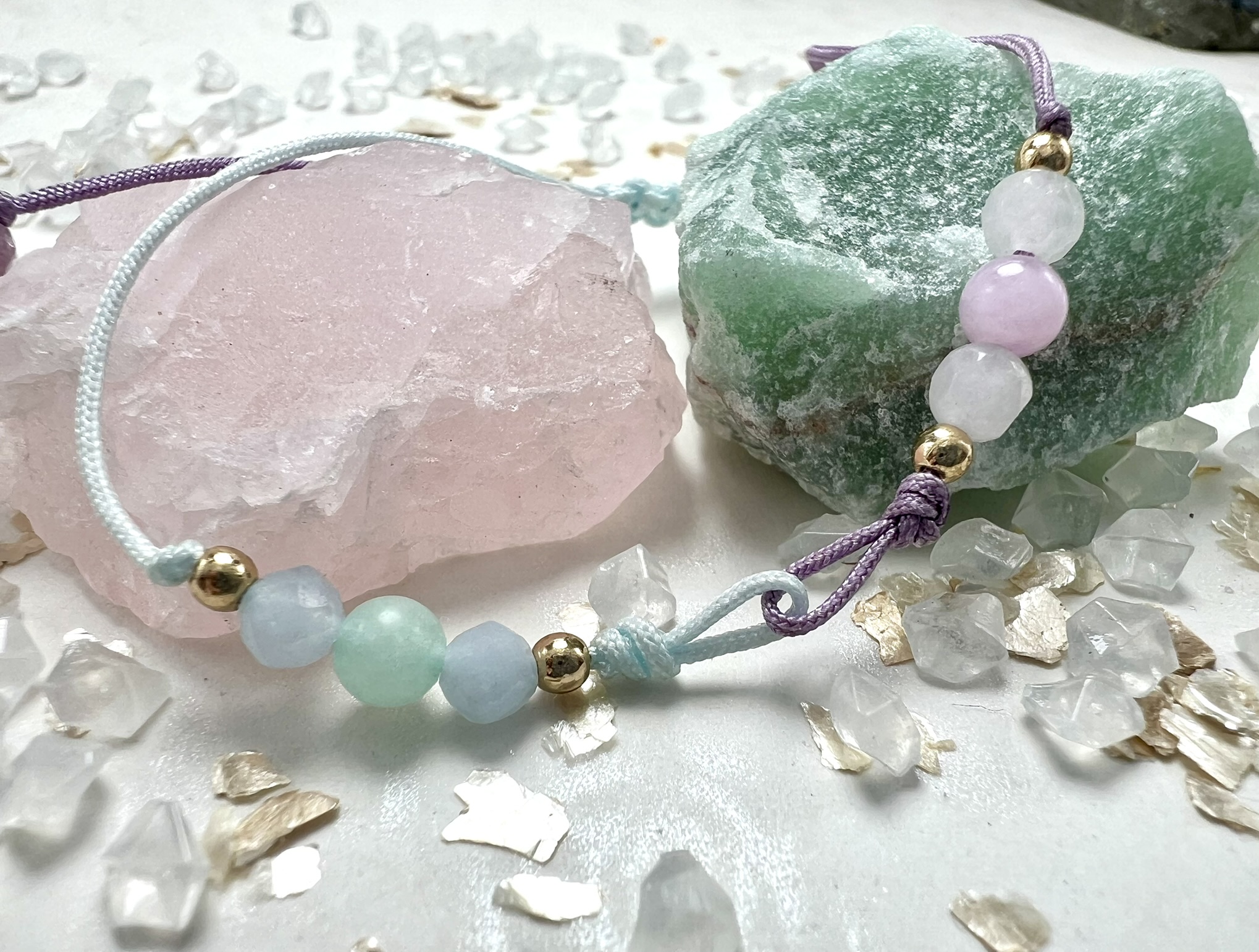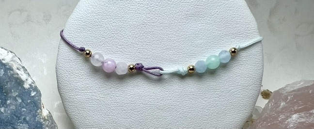 Bransoletka z Kunzytu, Kwarcu Różowego, Amazonitu, Akwamarynu i Fosfosyderytu – harmonizuje emocje, wzmacnia miłość i wewnętrzne ukojenie.