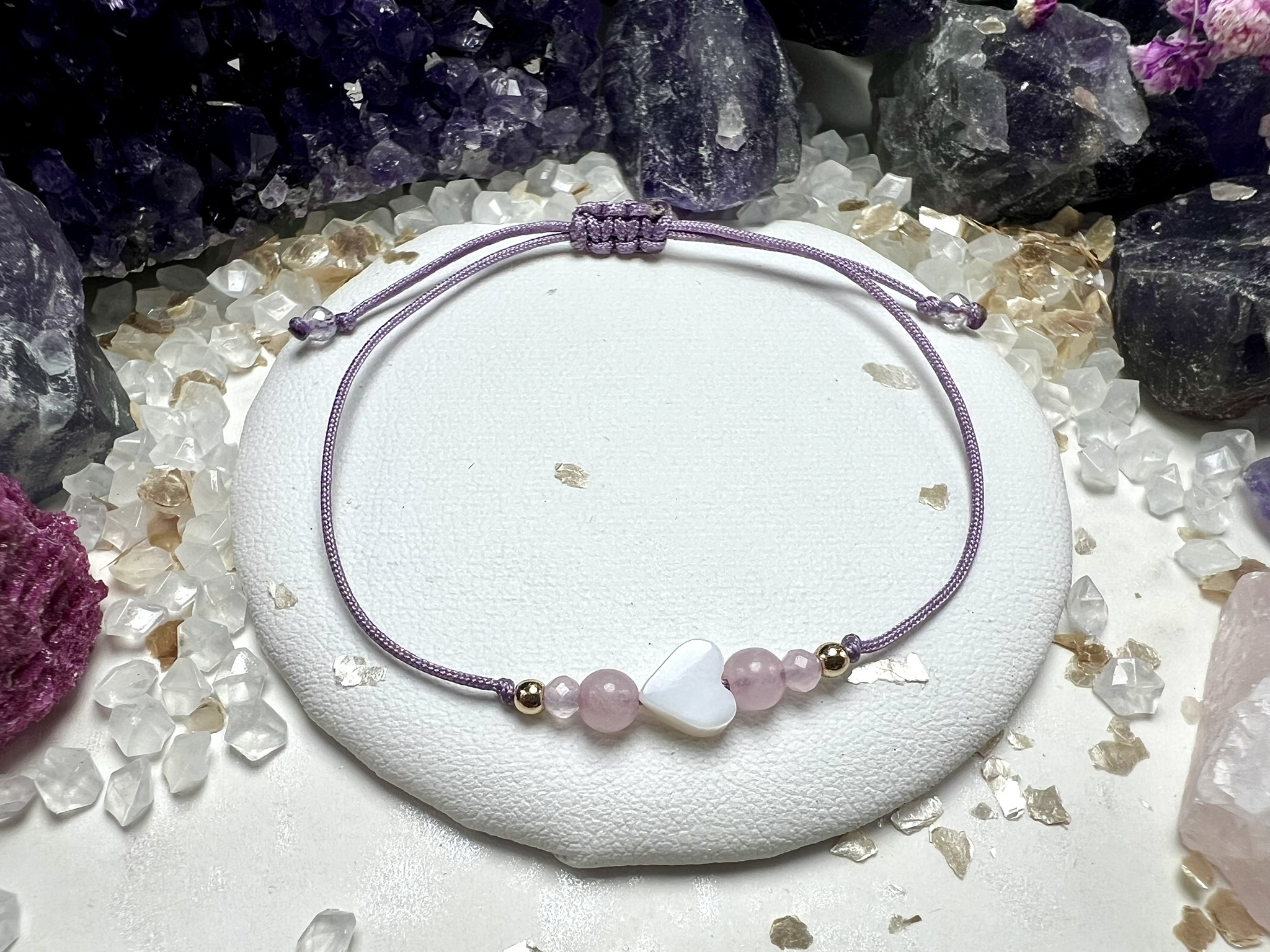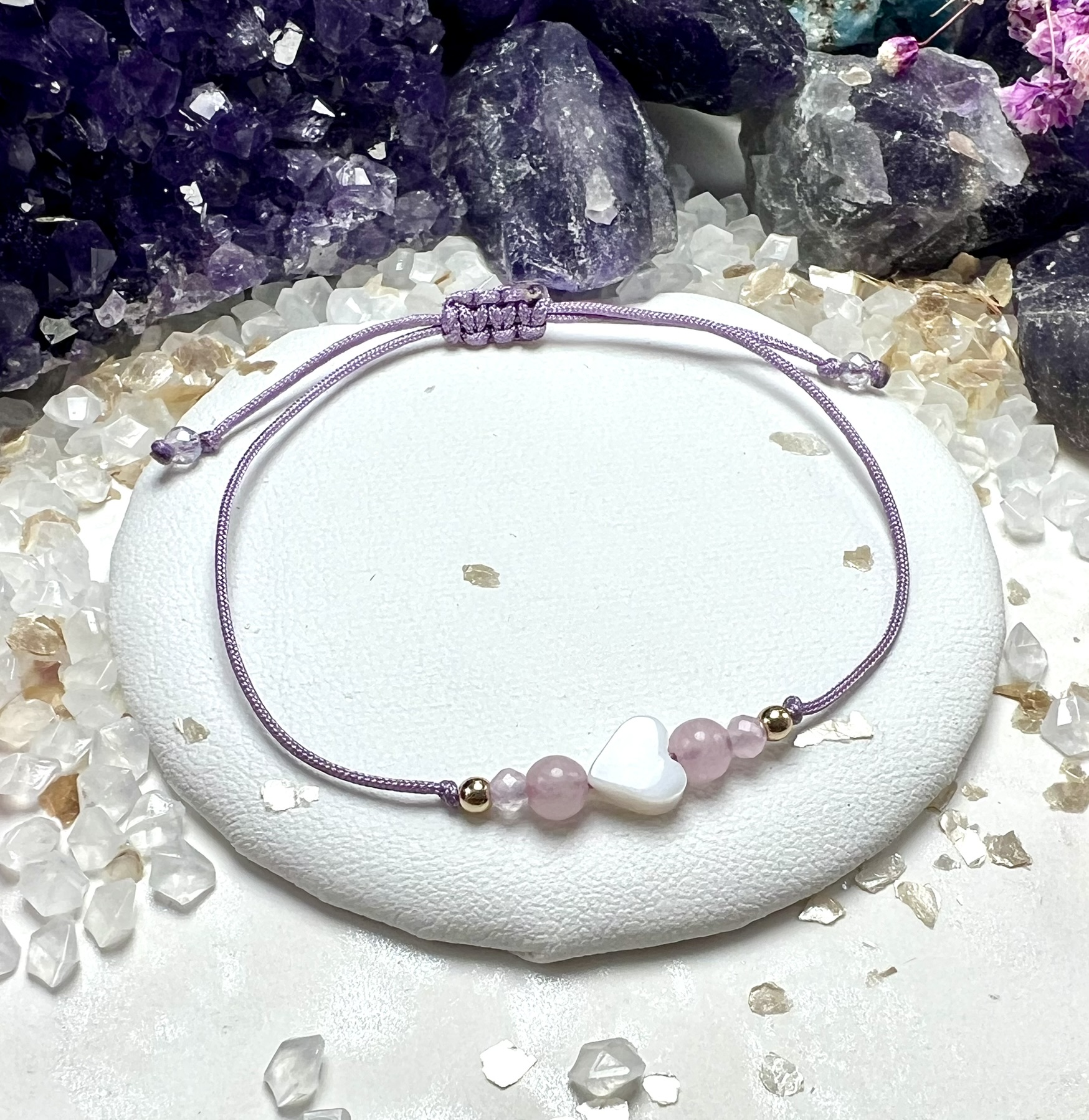 Talizman miłości i delikatnej energii – kwarc różowy, masa perłowa i kryształ górski splecione w harmonijną kompozycję czułości i wdzięczności.