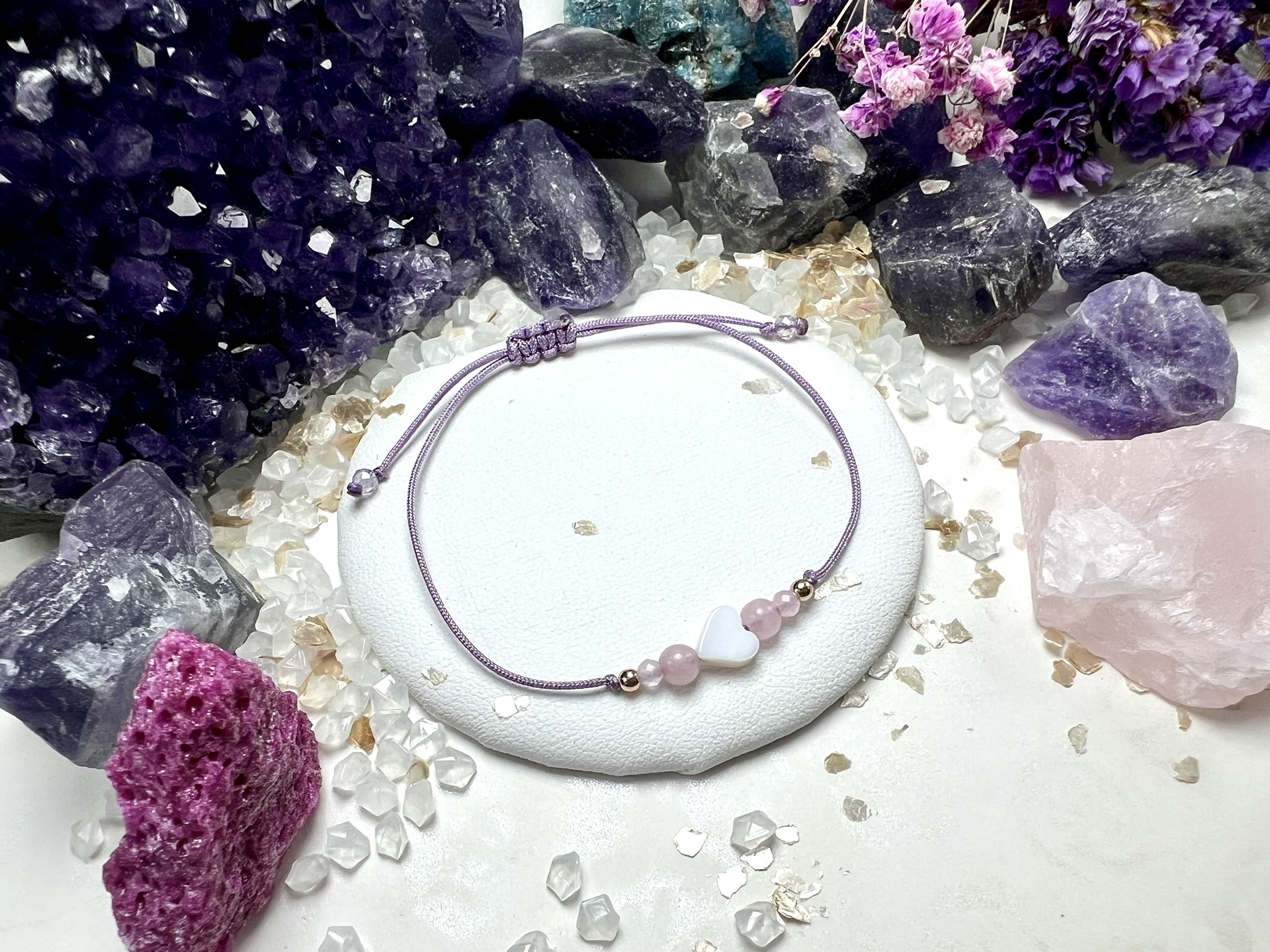 Złote przekładki z hematytu dodają elegancji i ochrony, a **wrzosowy sznurek** symbolizuje delikatność, spokój i wewnętrzne piękno.
