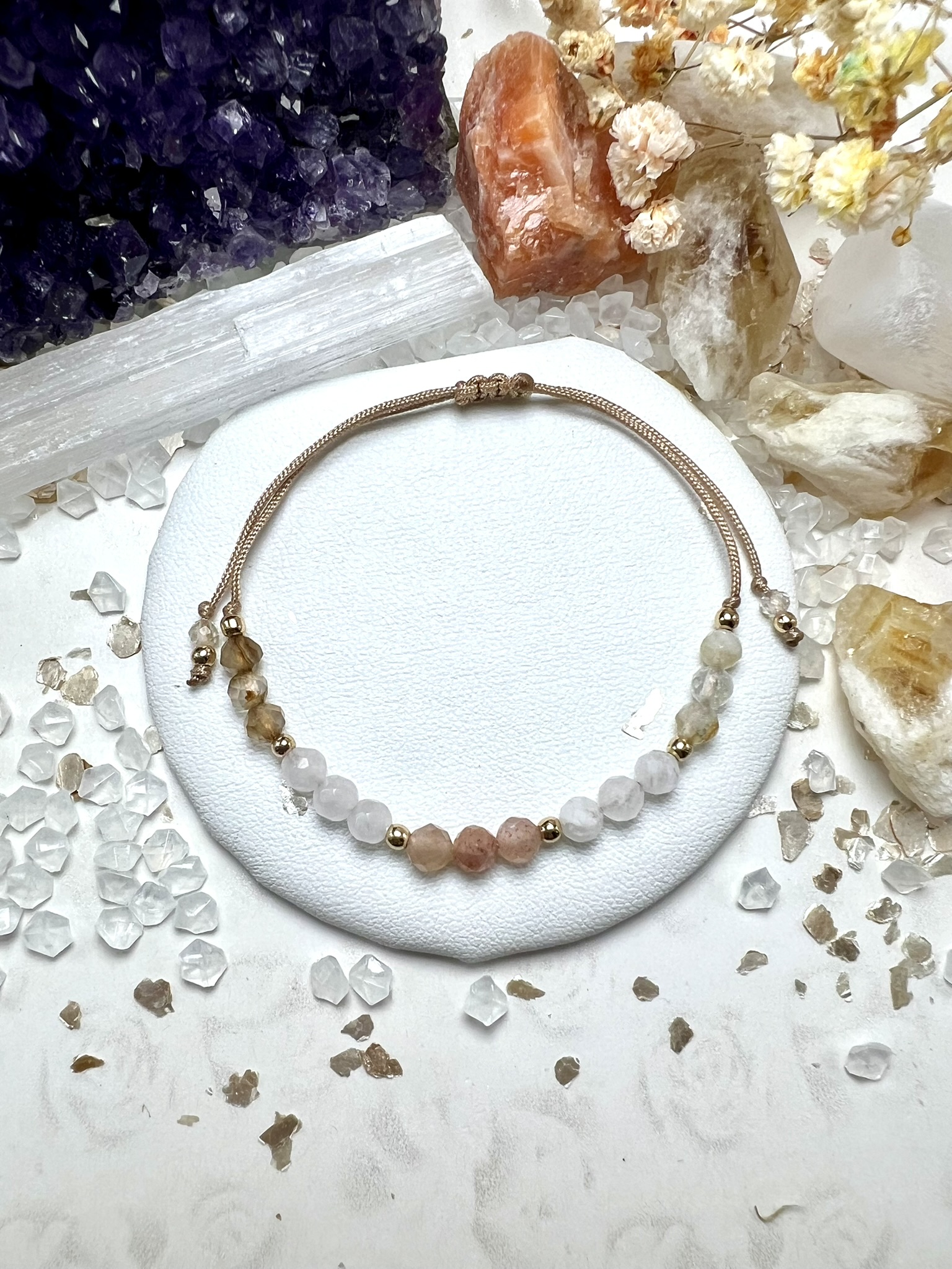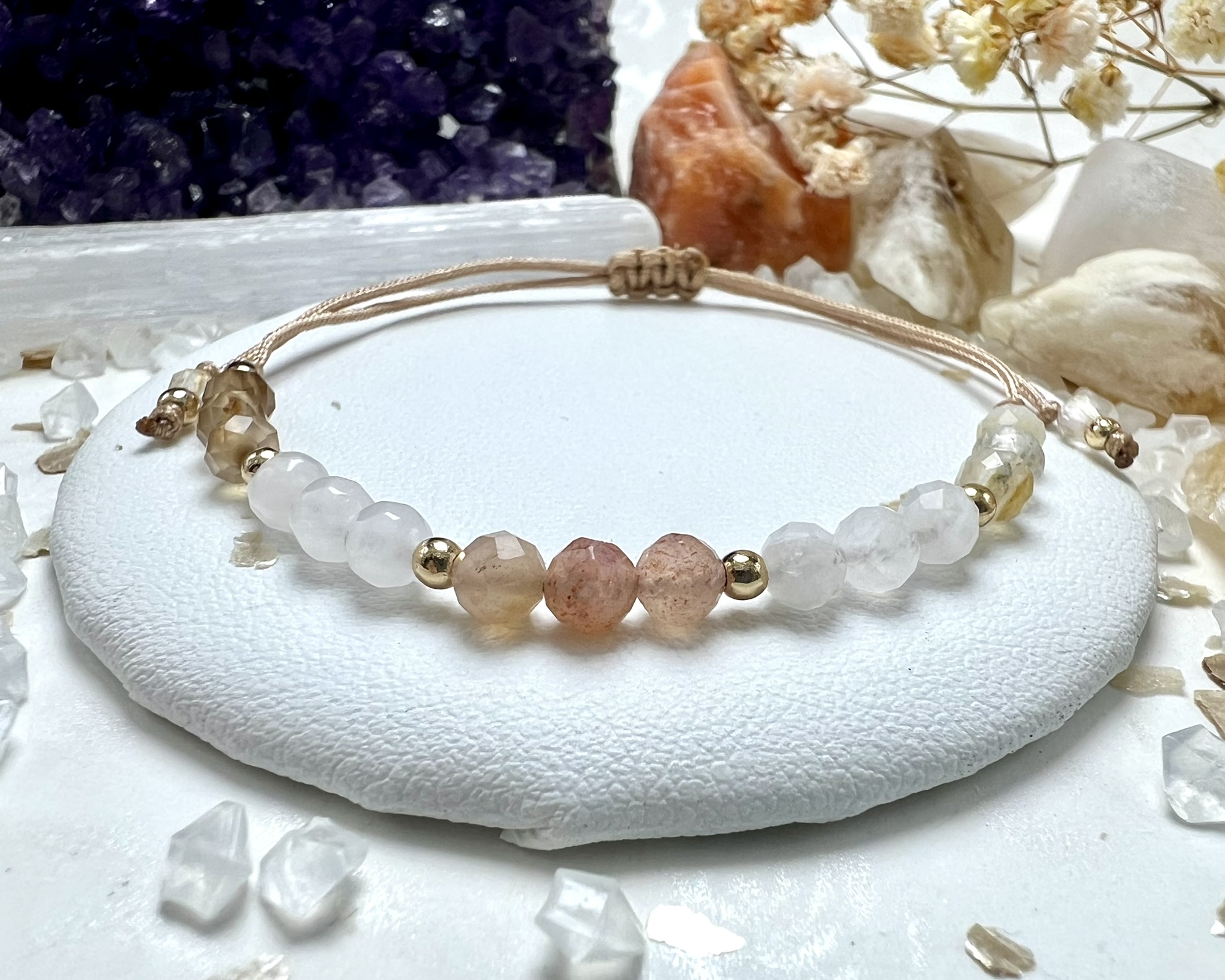 Bransoletka z Agatu Dymnego, Kwarcu Różowego, Kamienia Słonecznego, Kamienia Księżycowego i Cytrynu – przyciąga szczęście, radość i wewnętrzny spokój. Uczy wdzięczności, harmonii i akceptacji.