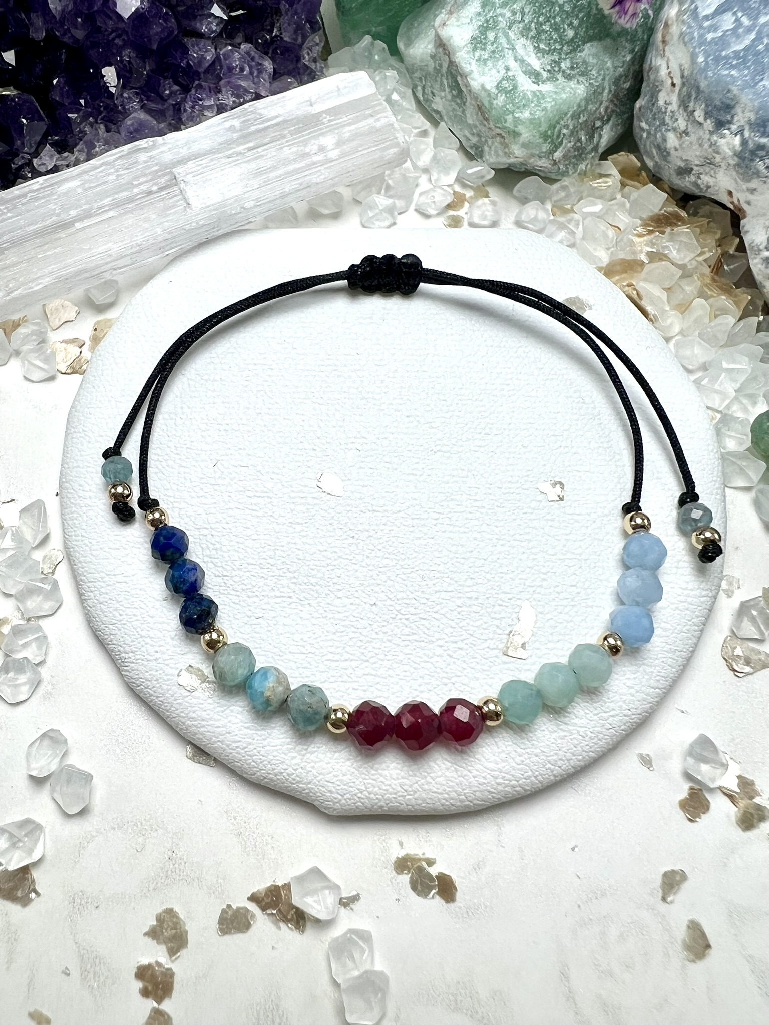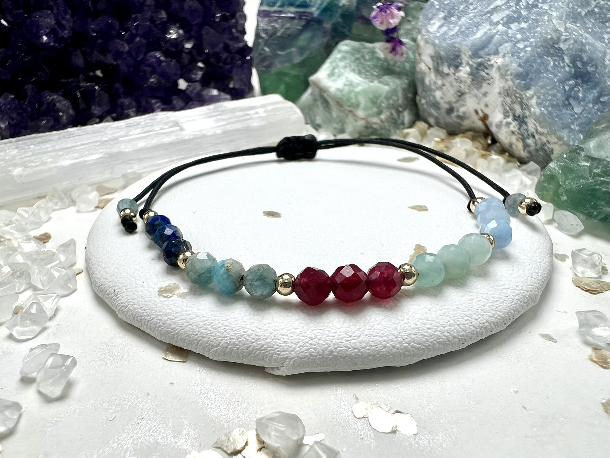 Bransoletka z Lapis Lazuli, Apatytem, Karneolem, Akwamarynem i Amazonitem – wspiera mądrość, odwagę i klarowność myśli. Uczy podejmować decyzje w zgodzie z intuicją i spokojem.