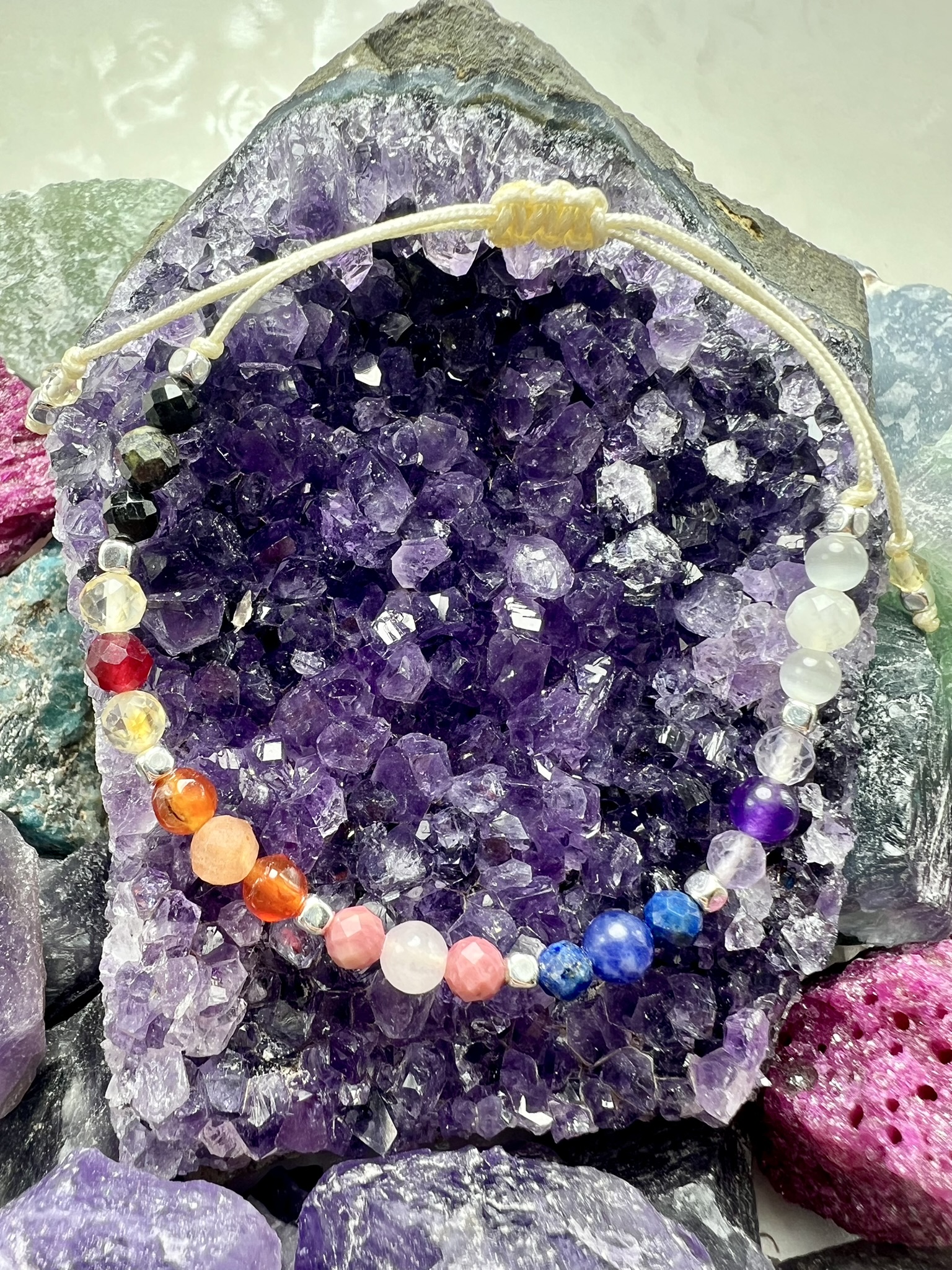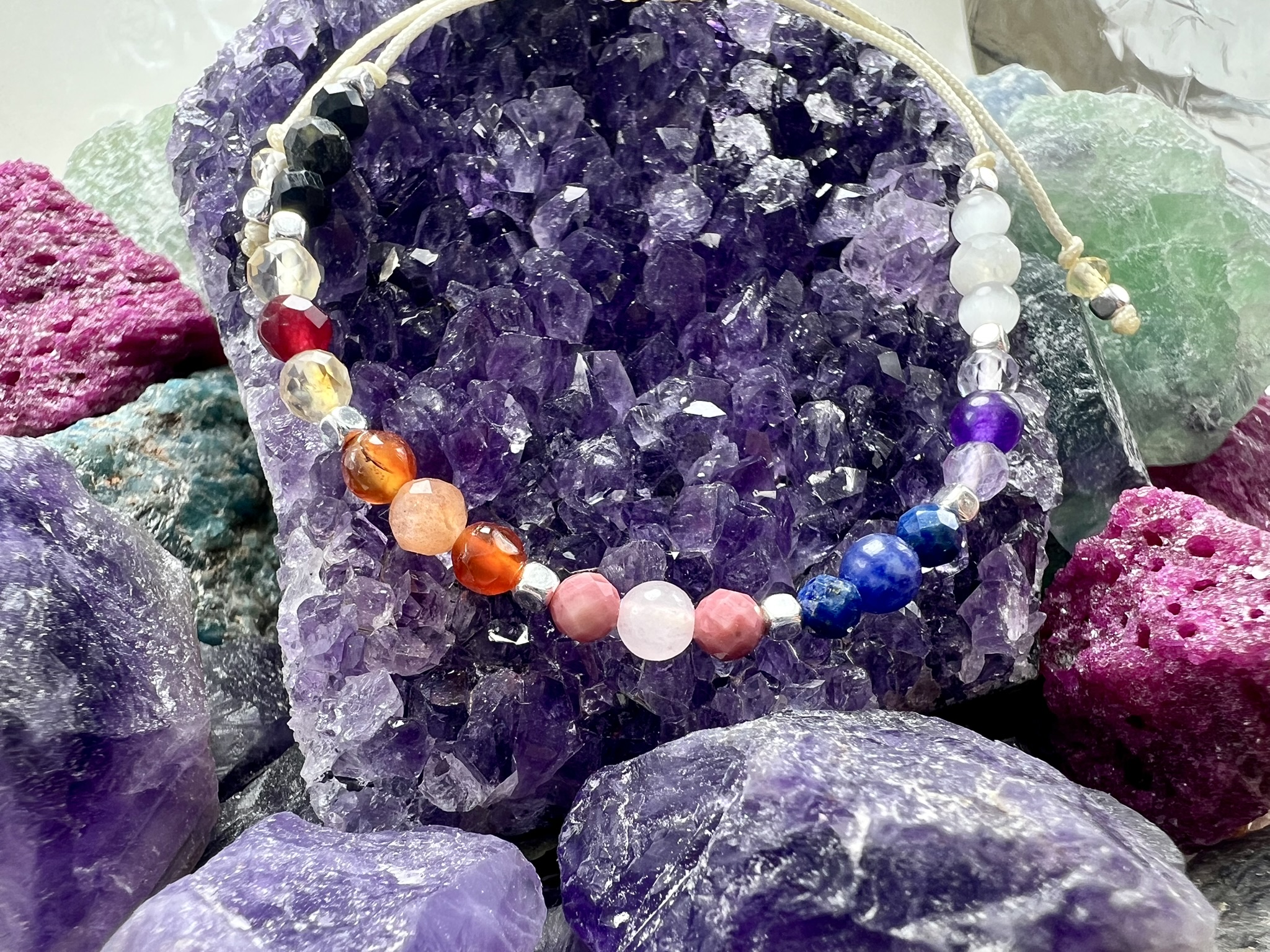 Talizman czystej energii, równowagi i przebudzenia – piętnaście kamieni odpowiadających siedmiu czakrom splecionych w świetlistą bransoletkę, która rozświetla aurę i przywraca harmonię ciała, umysłu i ducha.