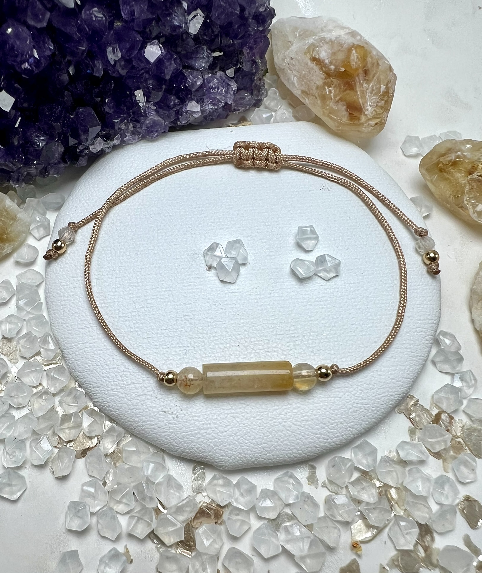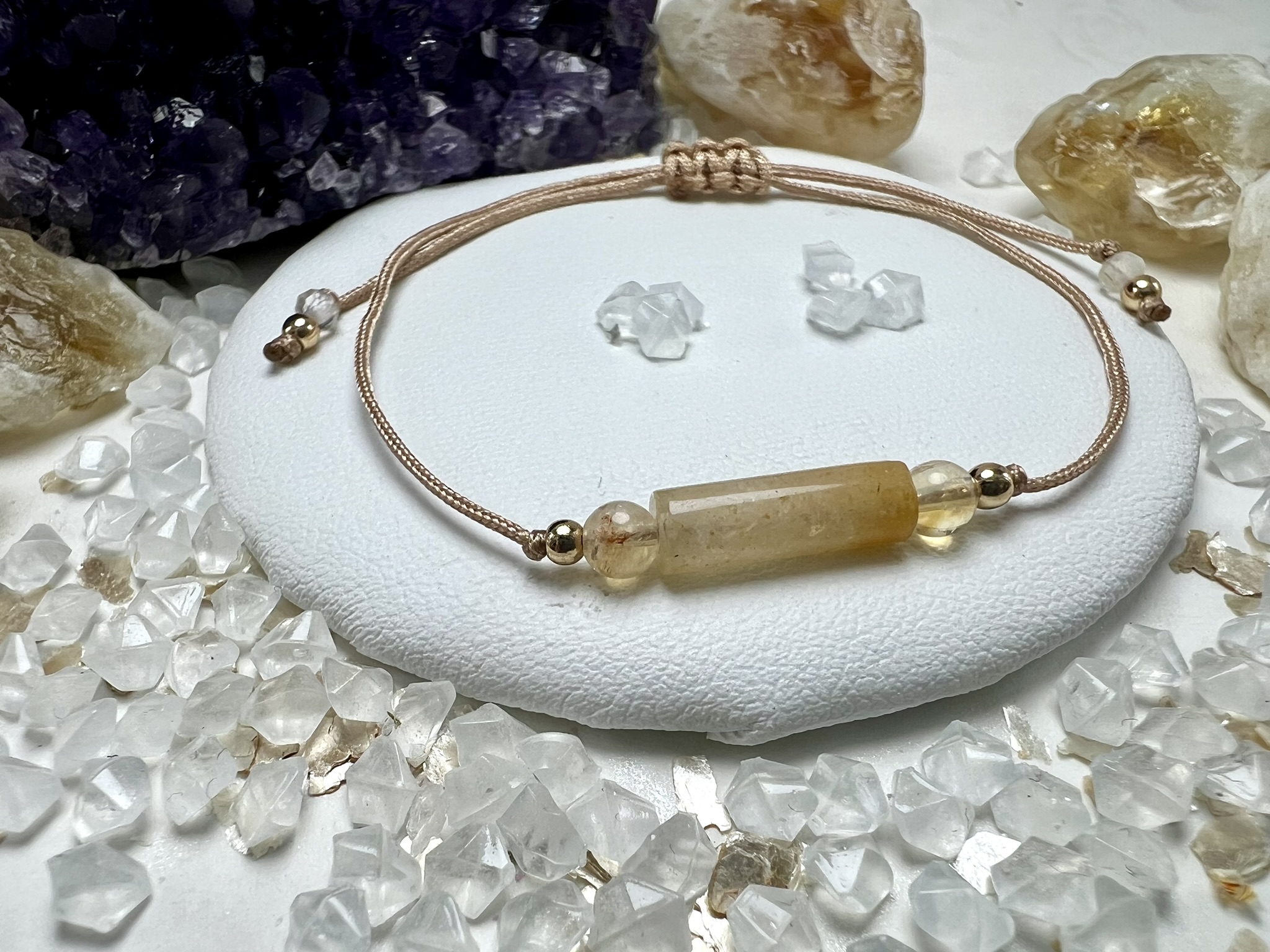 „Bransoletka Światła i Radości” to promienny talizman pozytywnej energii i wiary w siebie. Jej centrum stanowi cylindryczny kamień Topazu Żółtego, który symbolizuje wewnętrzne słońce – siłę, radość i ciepło, które świecą z wnętrza duszy.
