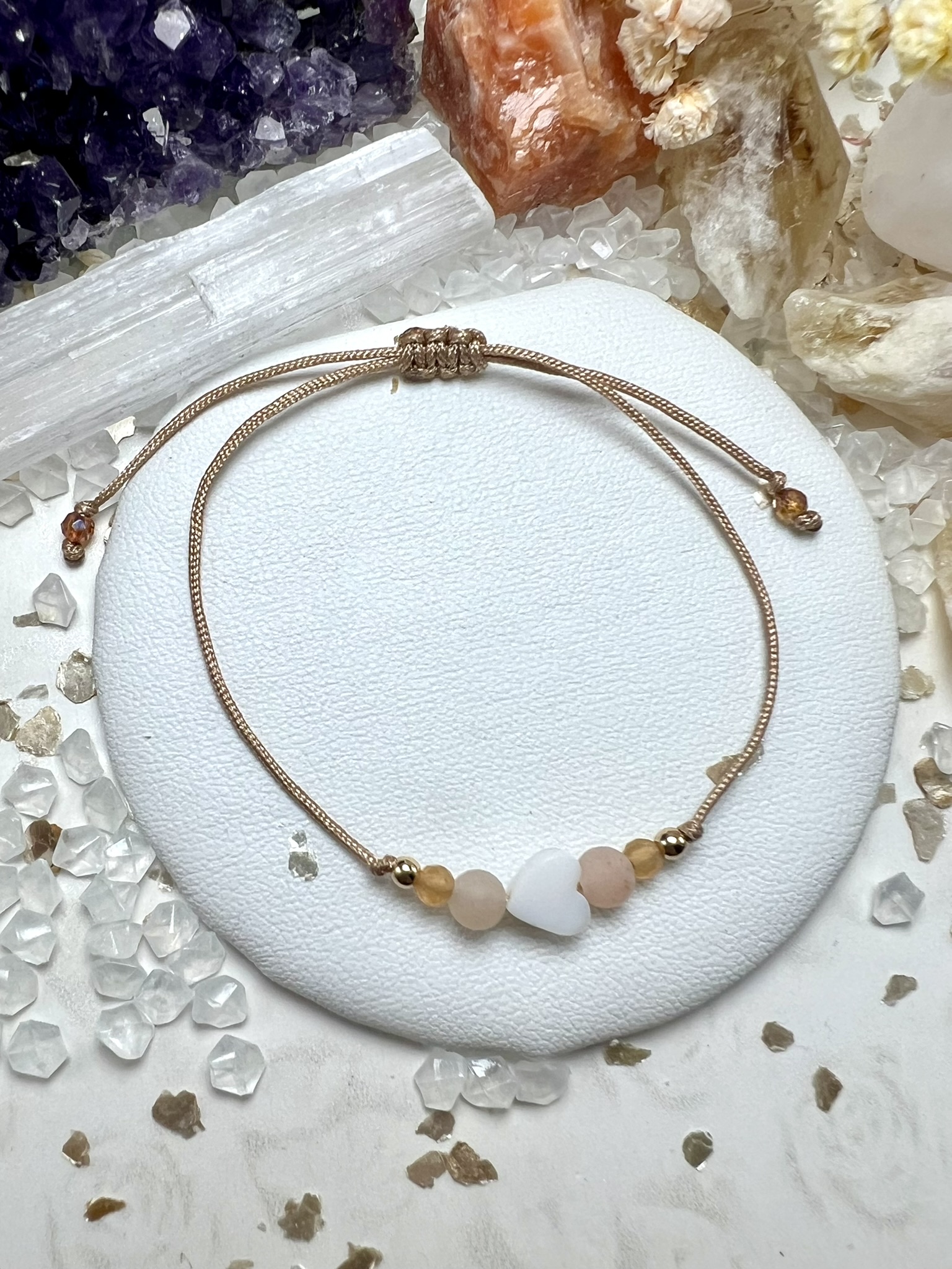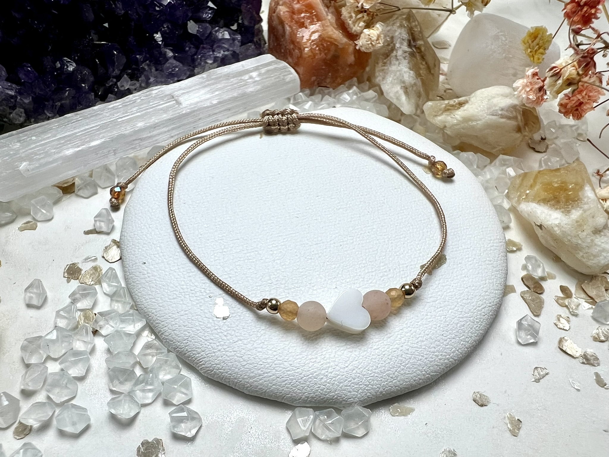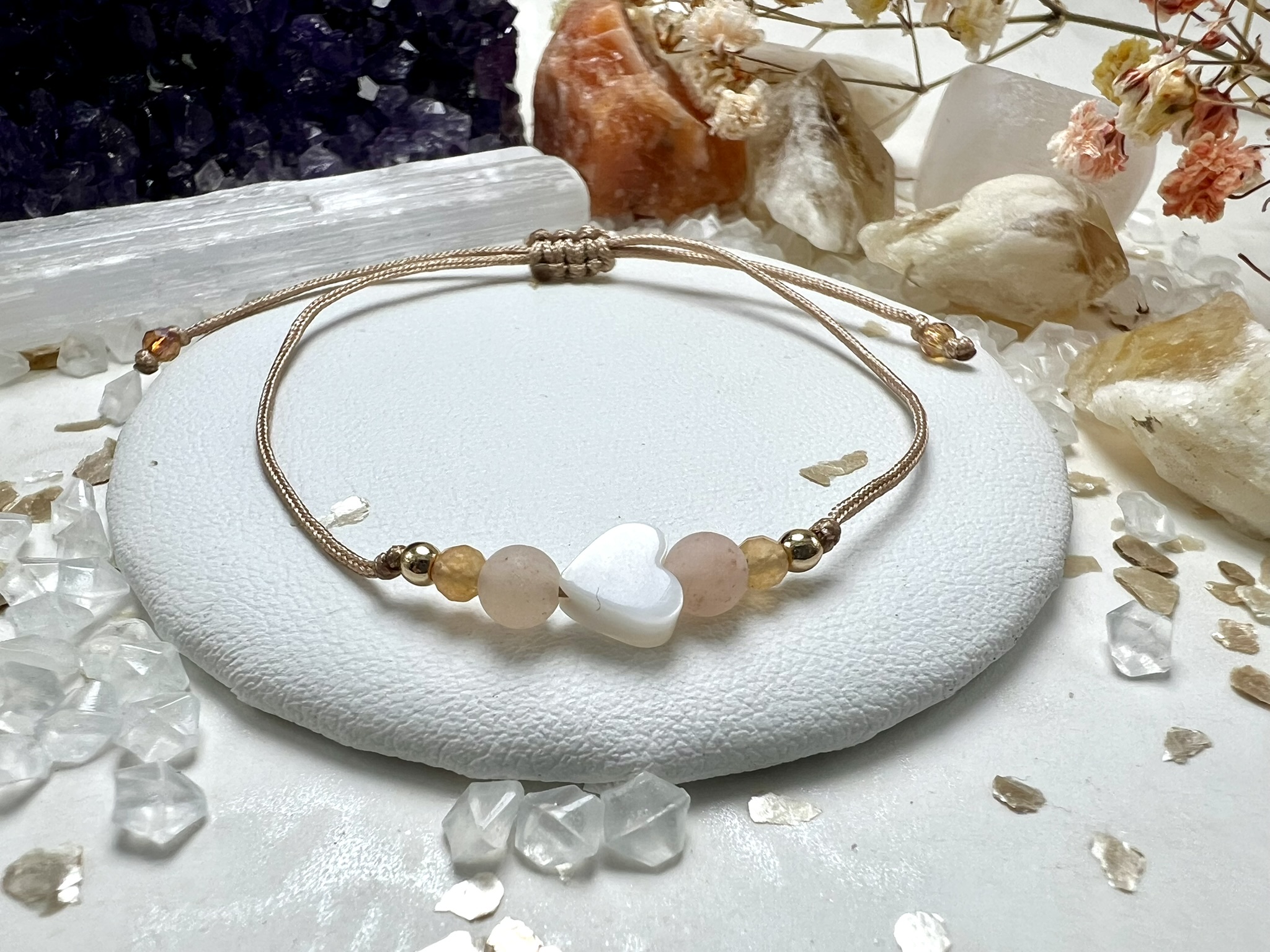 Talizman radości i nowego początku – awenturyn brzoskwiniowy, kamień słoneczny i masa perłowa splecione w harmonijną kompozycję ciepła i optymizmu.