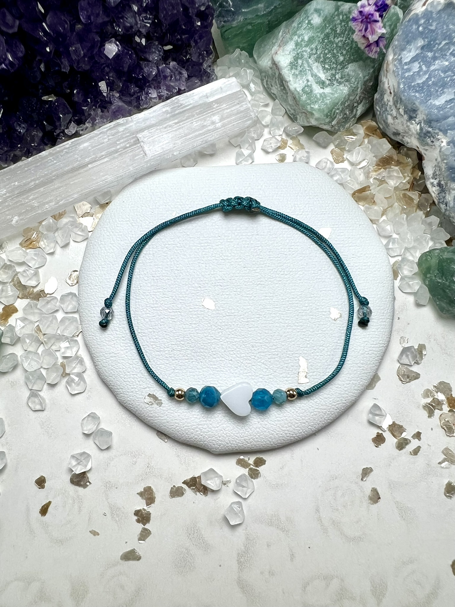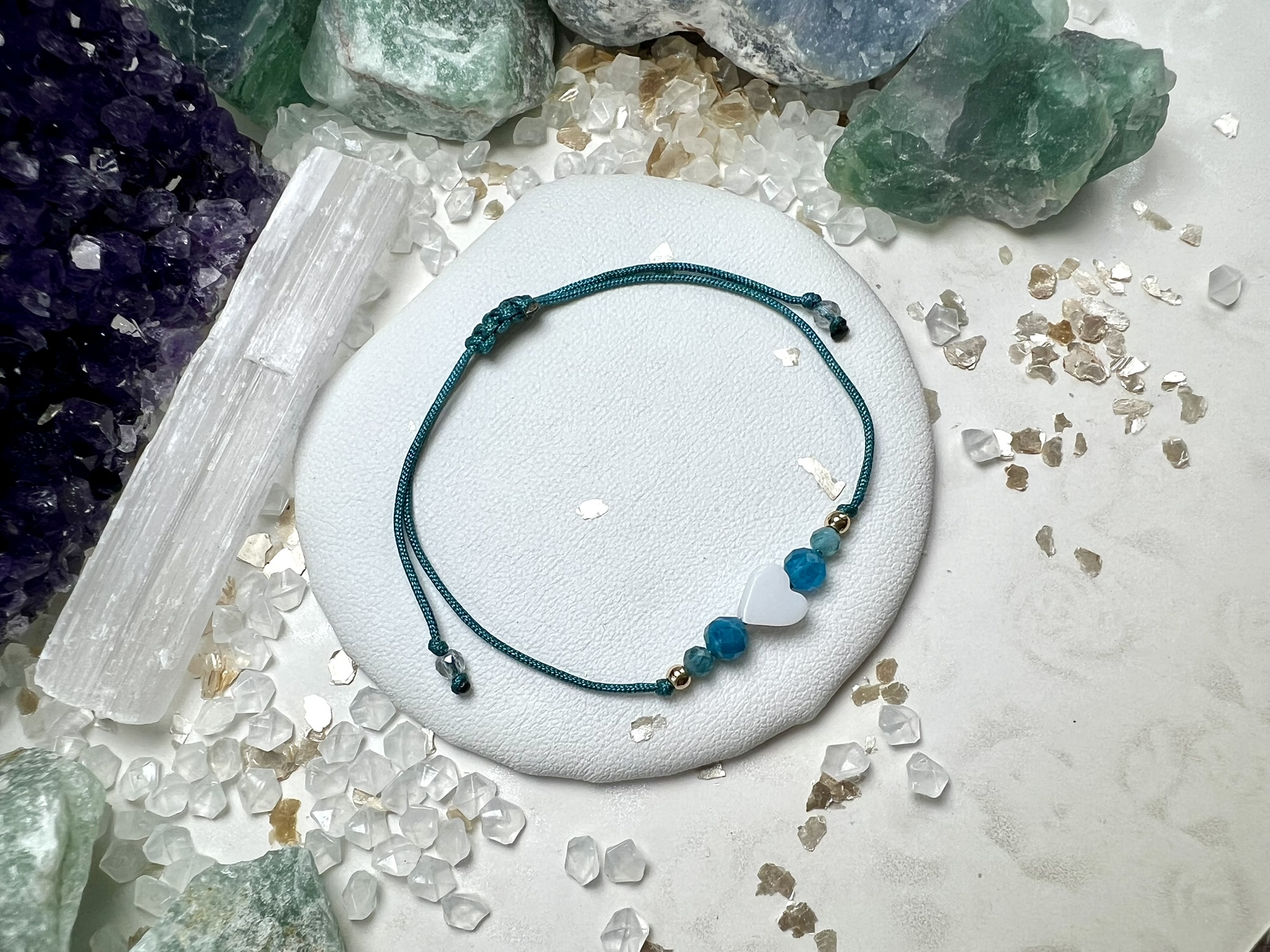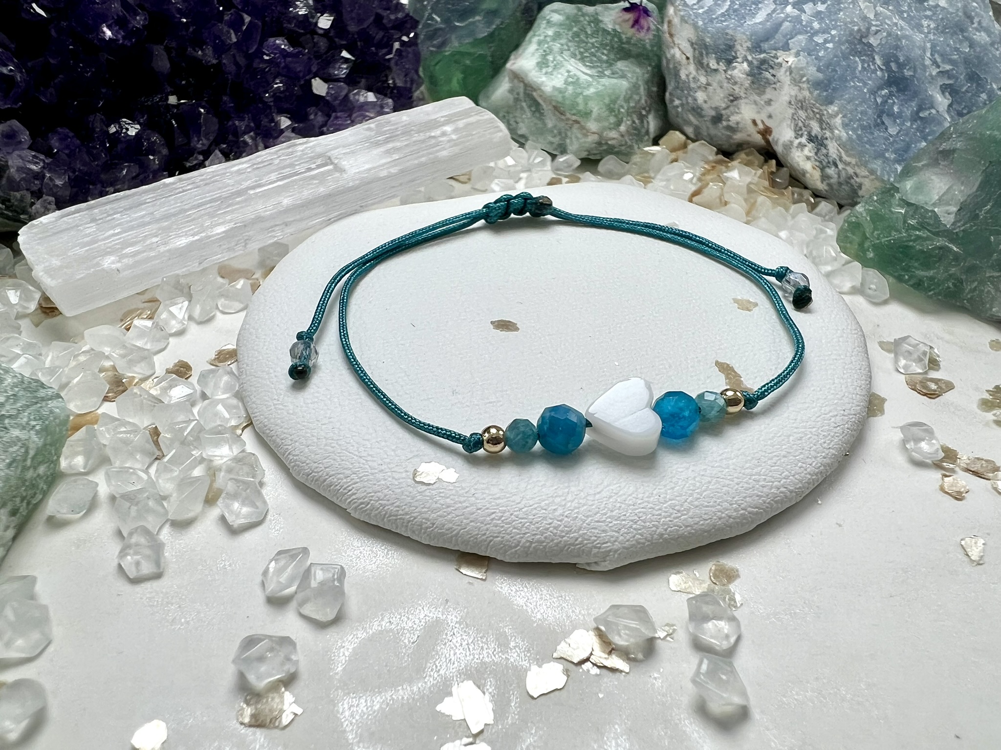 Talizman spokoju i komunikacji – masa perłowa, apatyt i kwarc splecione w bransoletkę Szeptów Oceanu, niosącą klarowność i odwagę serca.