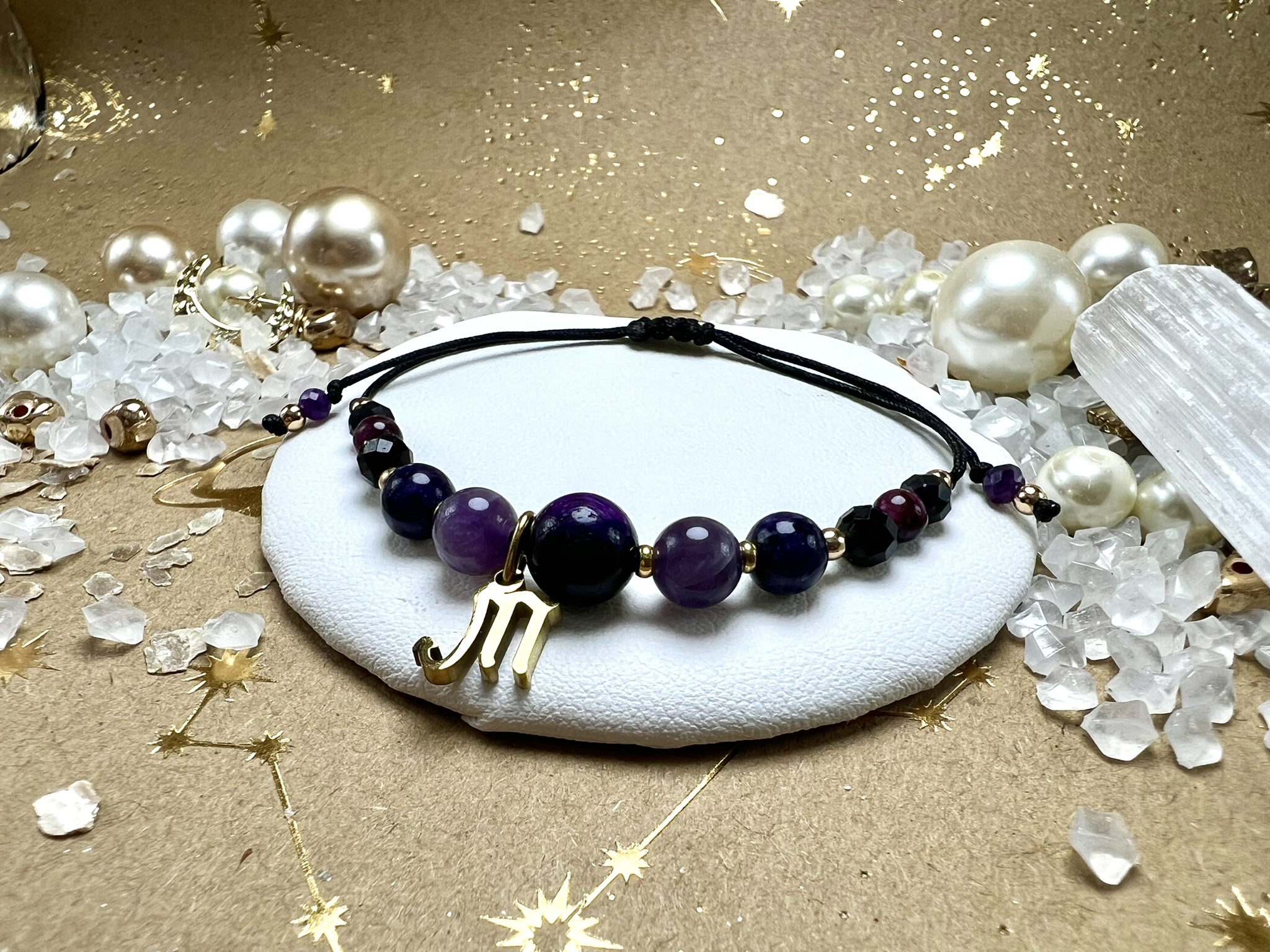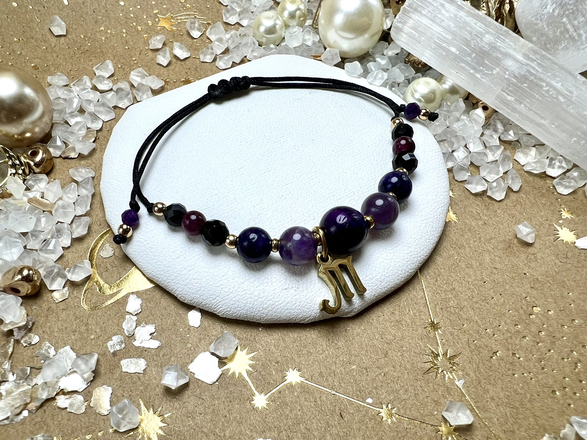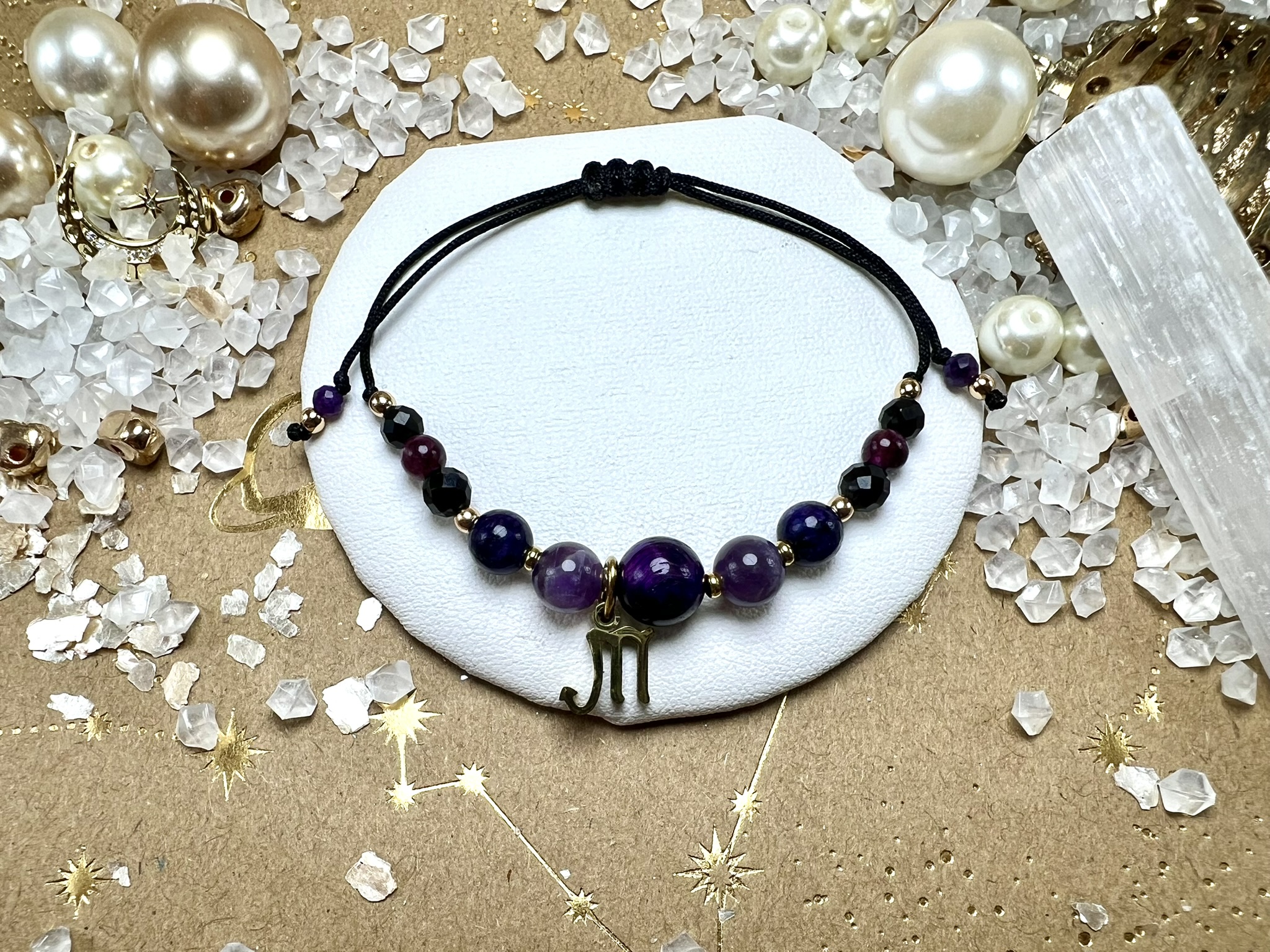 Złote przekładki z Hematytu symbolizują równowagę między światłem a cieniem, a czarny sznureczek podkreśla siłę i tajemniczość Skorpiona.