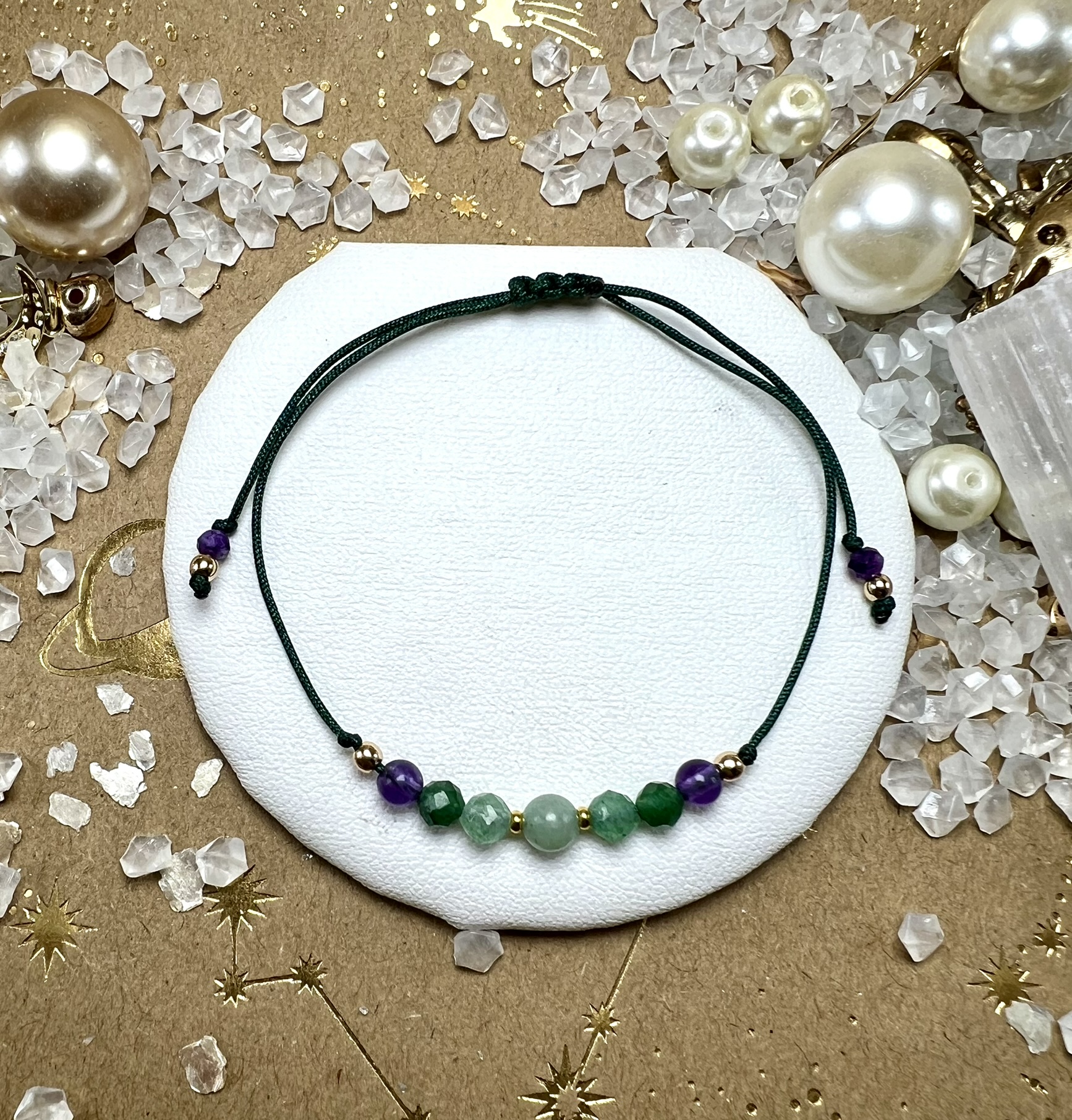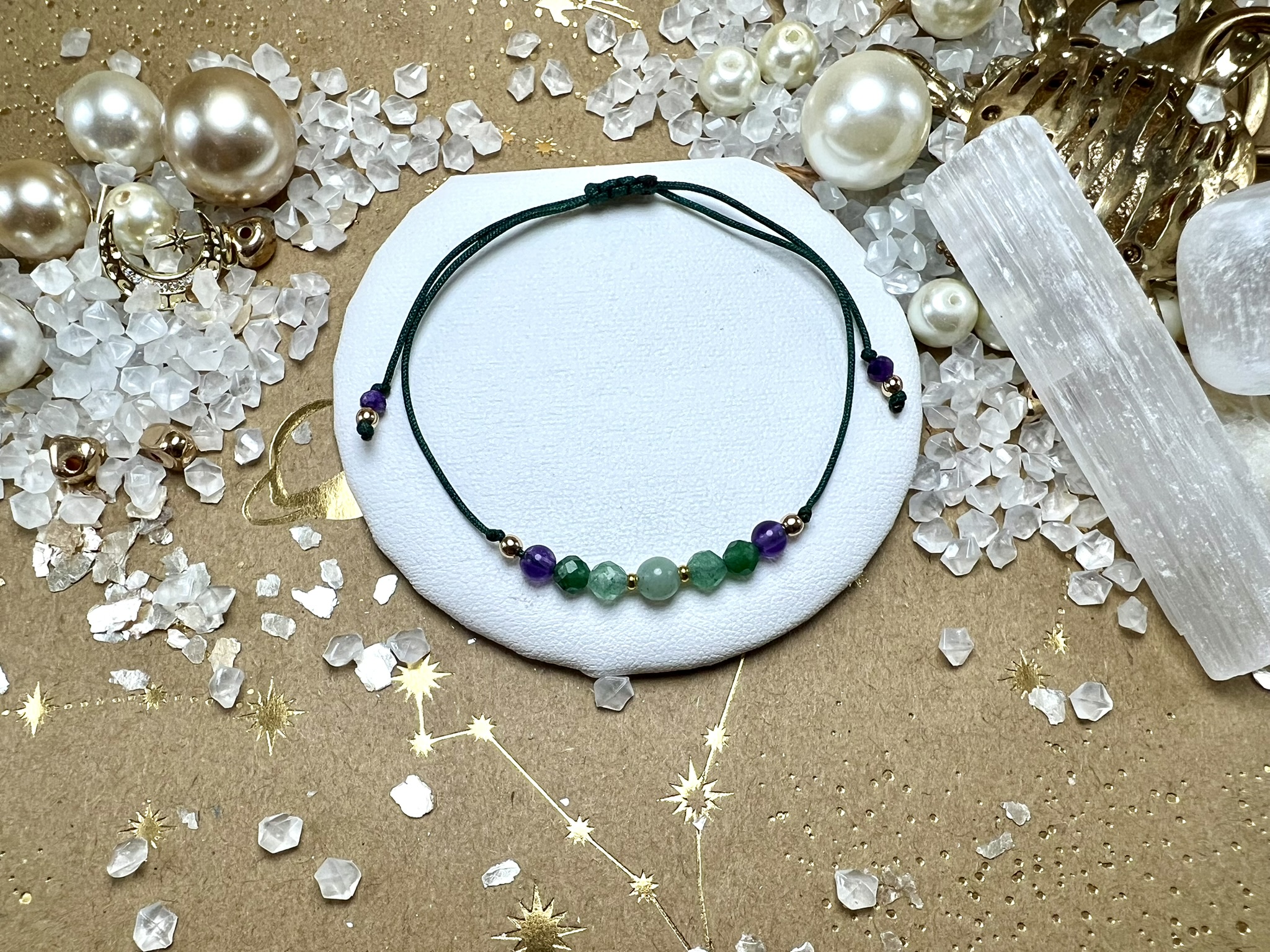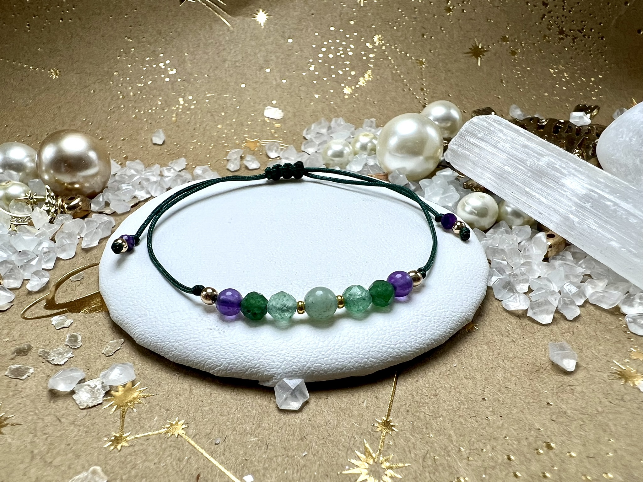Bransoletka z Amazonitu, Awenturynu Zielonego, Jadeitu i Ametystu – wspiera równowagę, koncentrację i spokój umysłu.