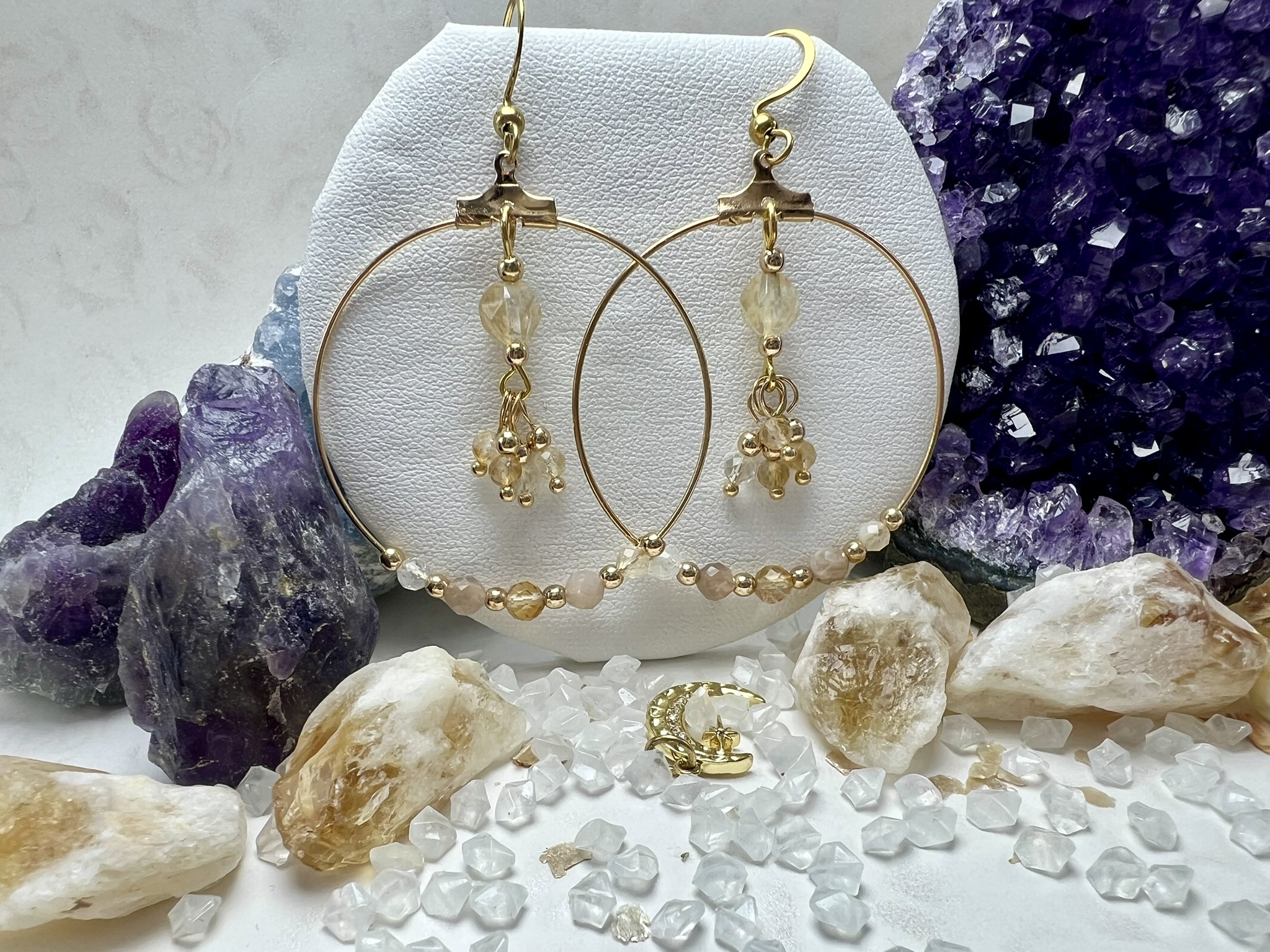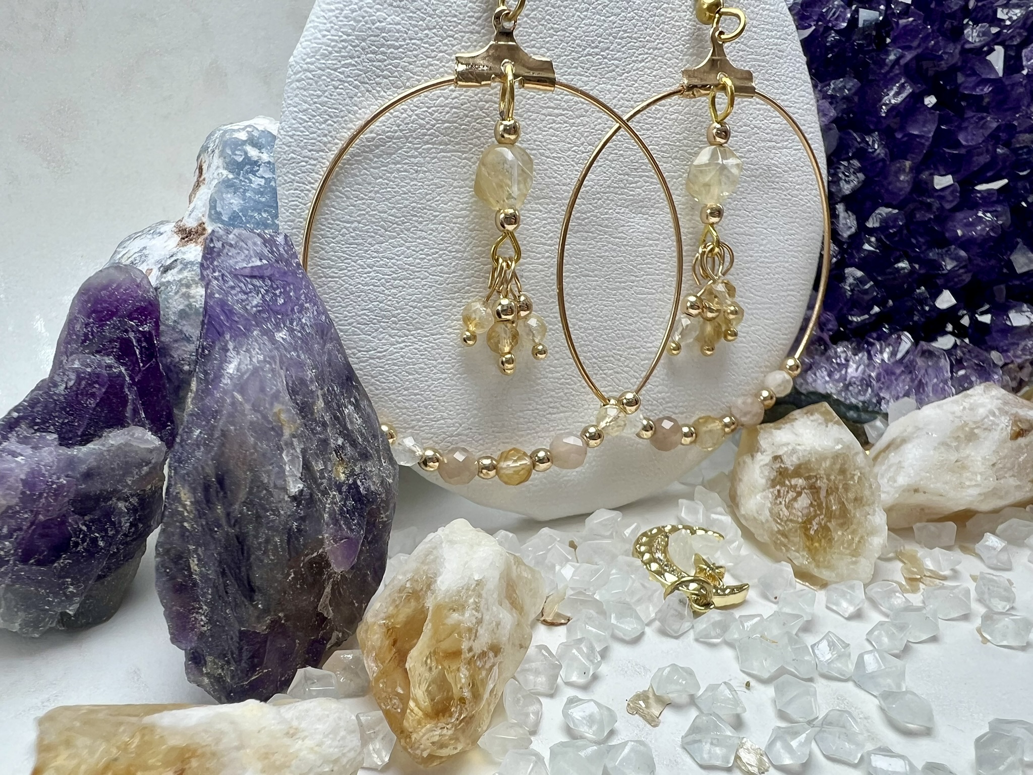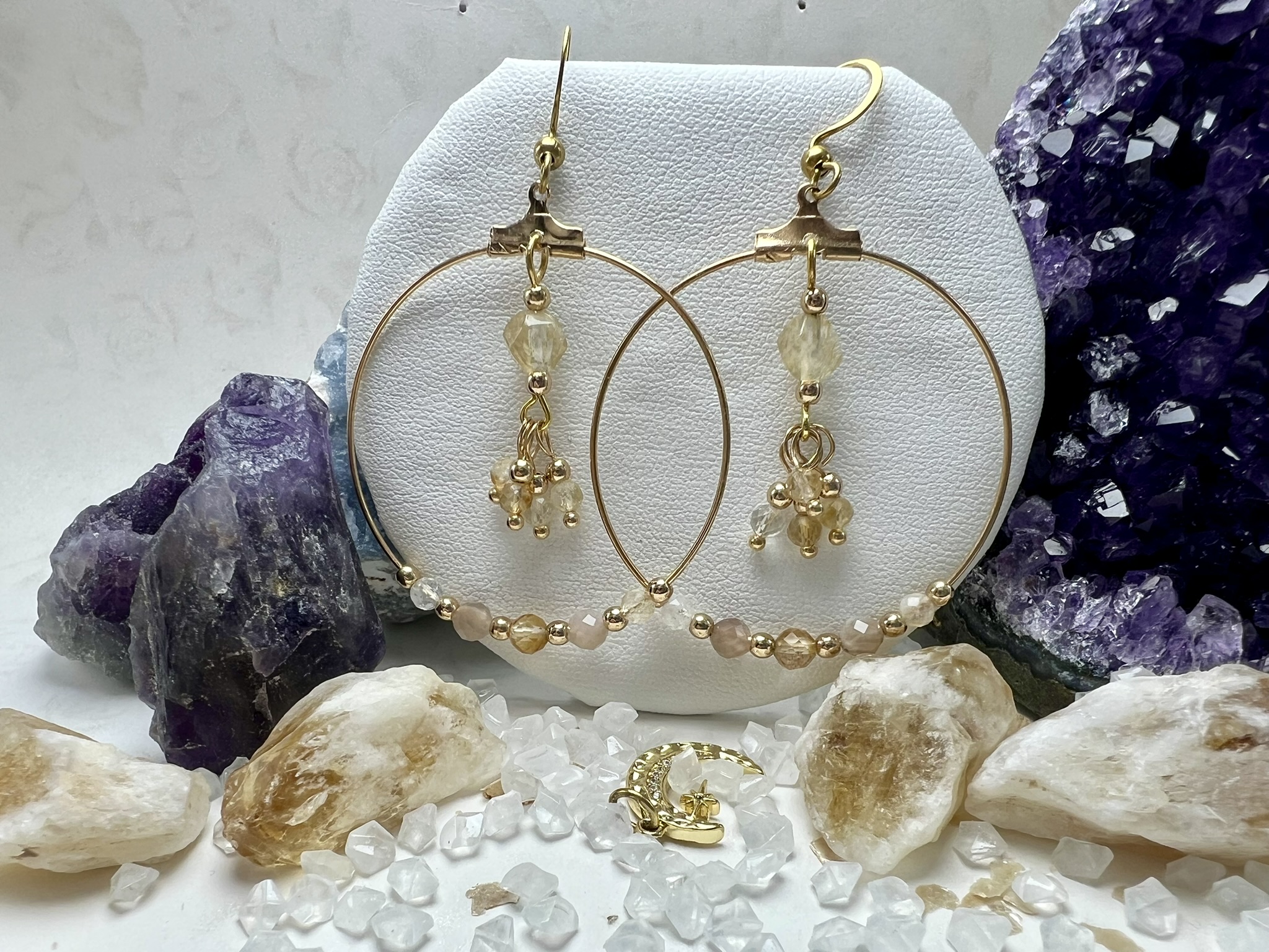 Kolczyki z Cytrynu i Agatu Beżowego – w kształcie koła z zawieszką z kamieni o różnych rozmiarach. Talizman radości, pewności siebie i obfitości.