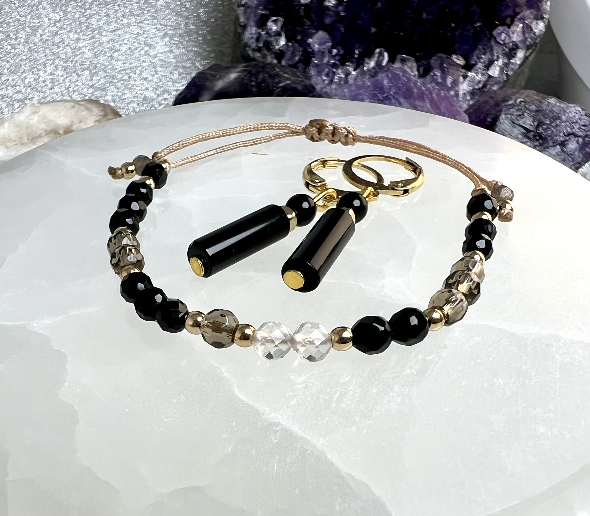 Onyks, czarny turmalin i kwarc dymny chronią i ugruntowują, a kryształ górski oczyszcza energię i wzmacnia działanie pozostałych kamieni.