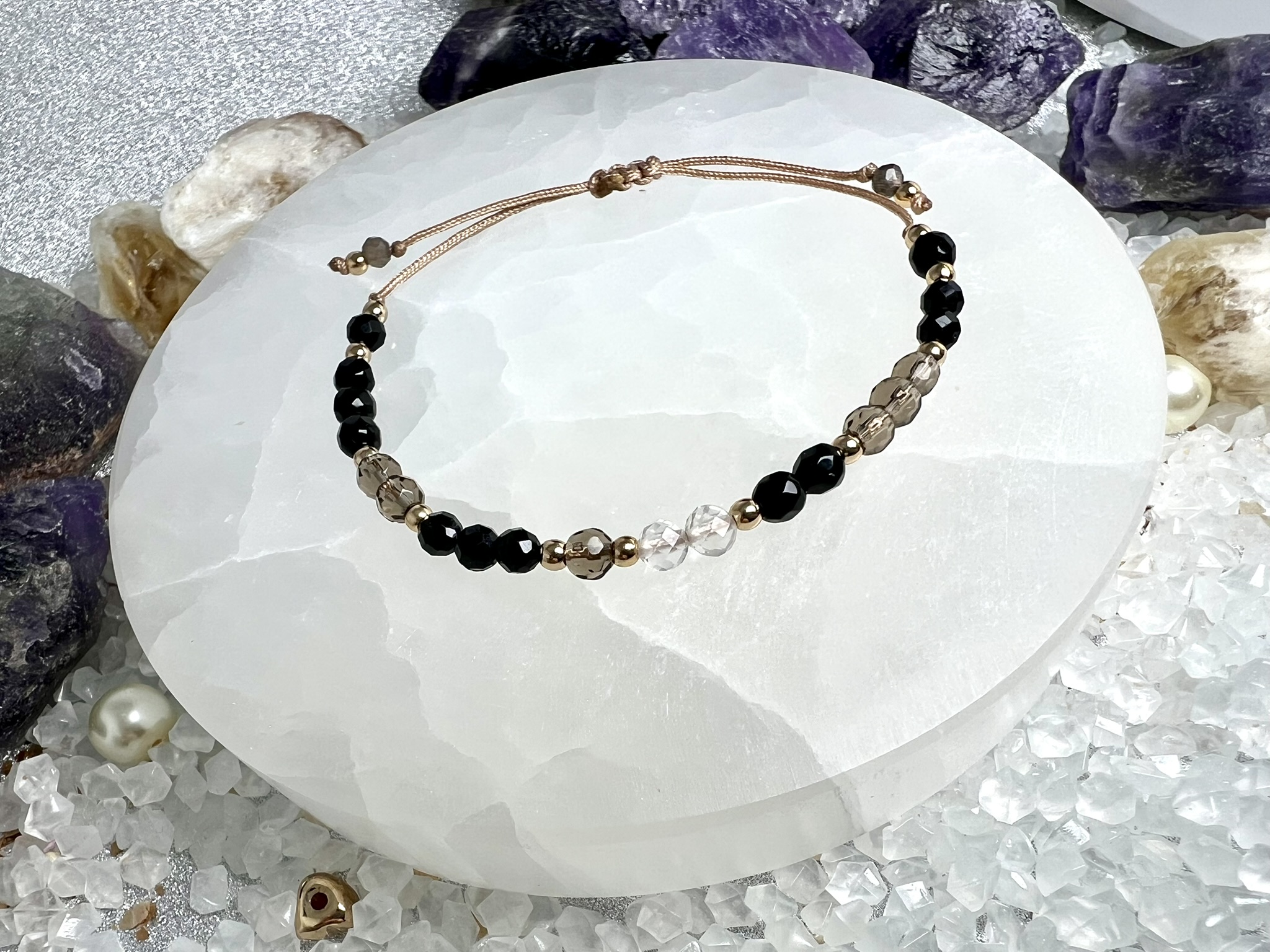 To mocna, a jednocześnie zrównoważona kompozycja ochronna. Czarny turmalin i onyks tworzą tarczę energetyczną, kwarc dymny ugruntowuje i pomaga uwalniać napięcia, a kryształ górski oczyszcza i harmonizuje całość. Złote przekładki z hematytu stabilizują przepływ energii.