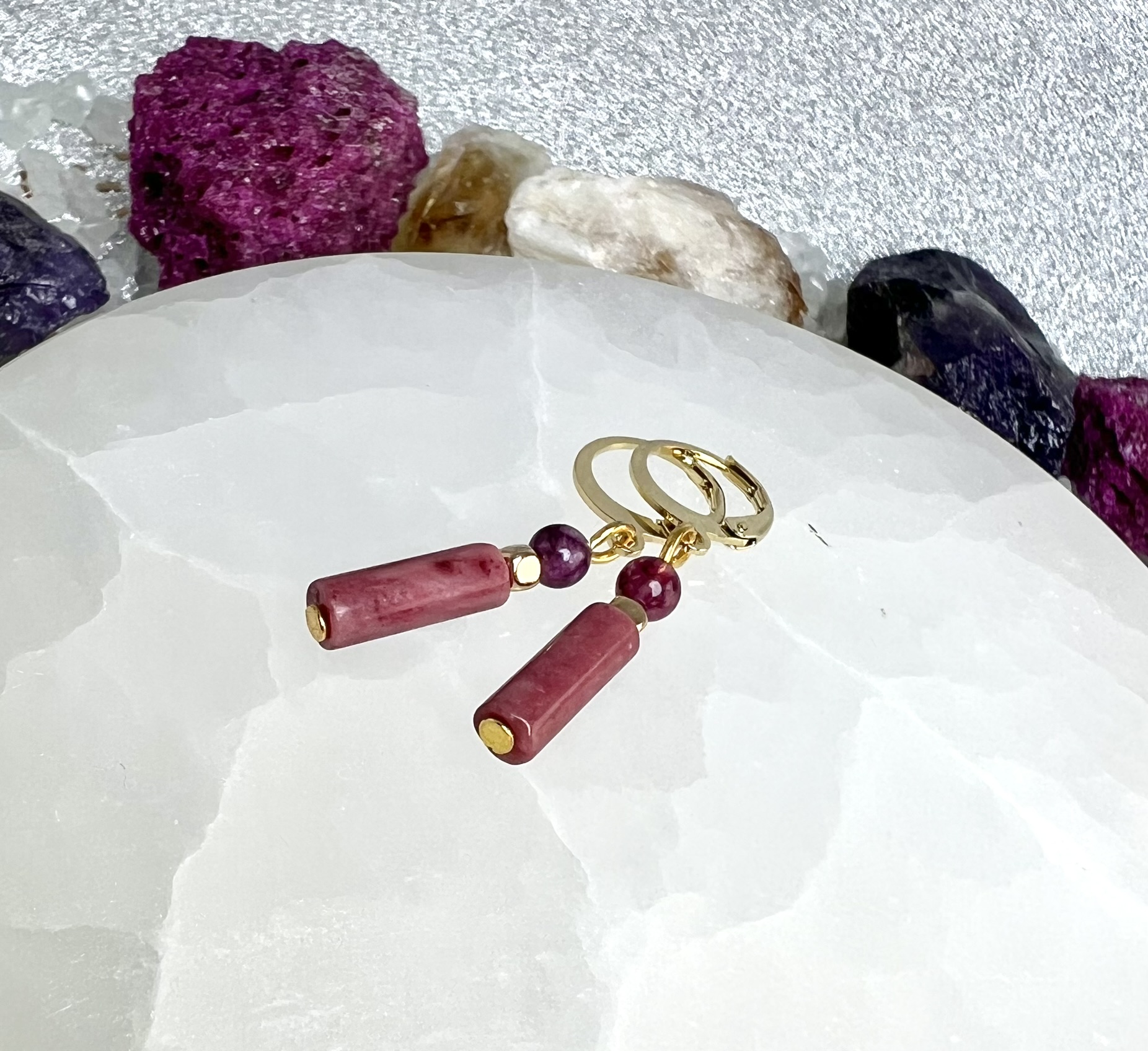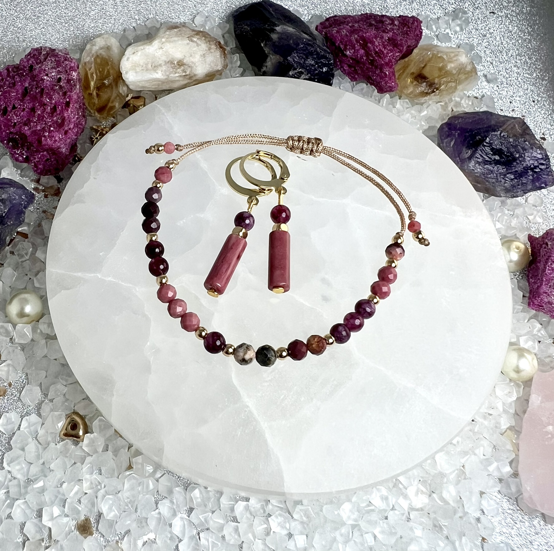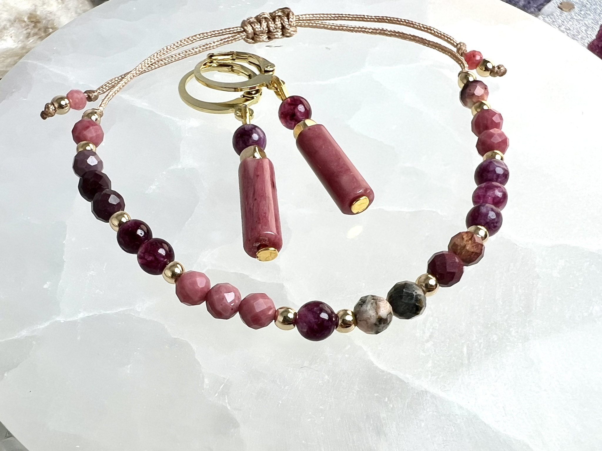 Zestaw „Ciepło Relacji” łączy energię rodonitu i granatu z kojącą mocą mokaitu i rodochrozytu. Kolczyki oraz bransoletka na beżowym sznureczku wspierają harmonię w relacjach, pewność siebie i emocjonalne ukojenie.
