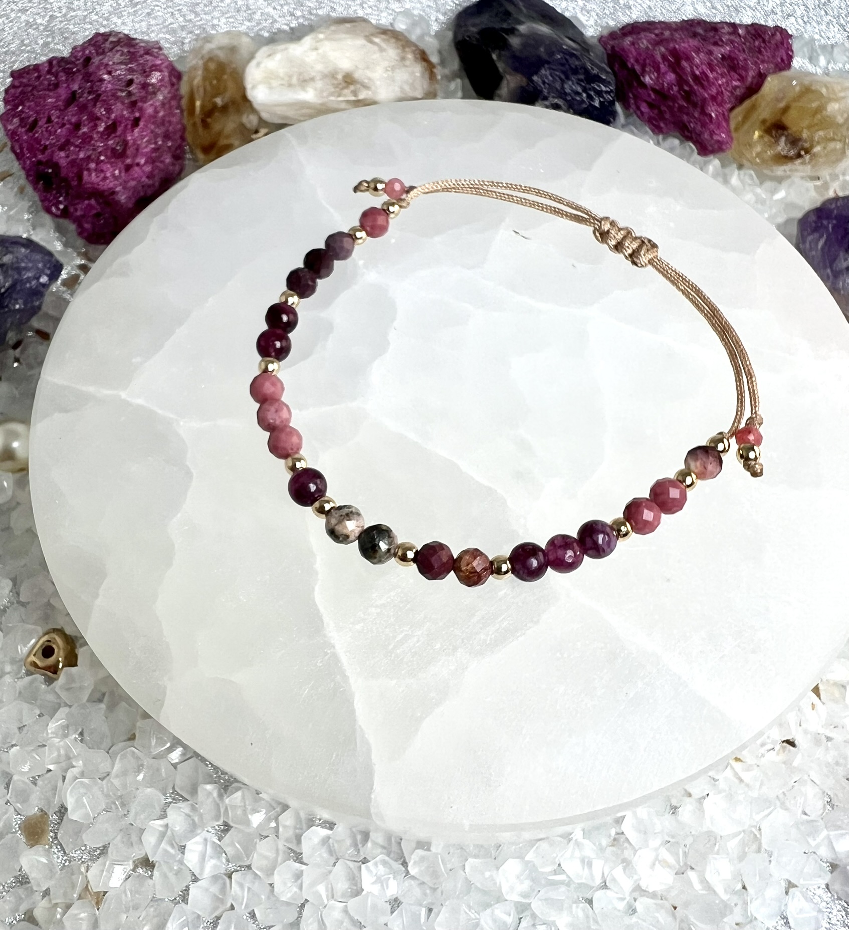 Rodonit łagodzi i koi, rodochrozyt otwiera serce, mokait stabilizuje emocje, a granat dodaje odwagi i energii. Razem tworzą wsparcie dla miłości własnej, harmonii i relacji pełnych zrozumienia.