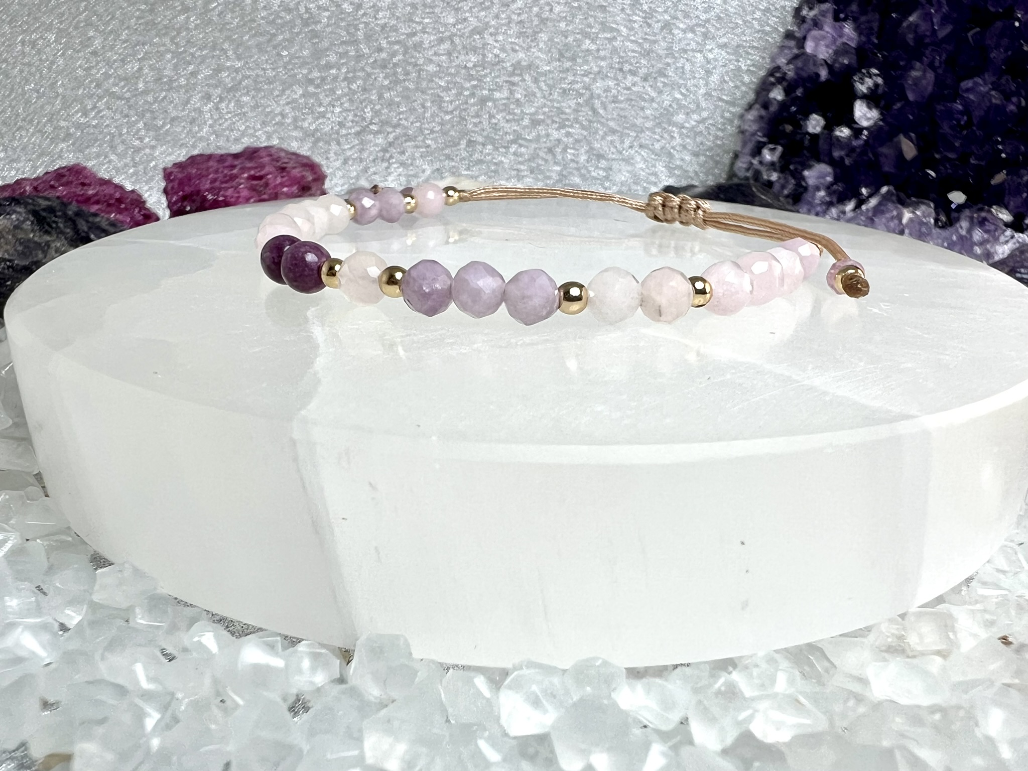 Zestaw „Miękka Siła Serca” to subtelna biżuteria wspierająca miłość, emocjonalną równowagę i wewnętrzną harmonię. Kwarc różowy, morganit, ametyst i granat tworzą czułą, ale wzmacniającą kompozycję na beżowym sznureczku ze złotymi akcentami.