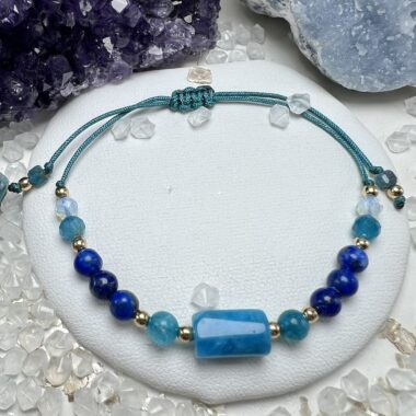 Bransoletka z Apatytu, Lapis Lazuli i Opalu z cylindrycznym kamieniem – wspiera wewnętrzną mądrość, komunikację i twórczy przepływ.