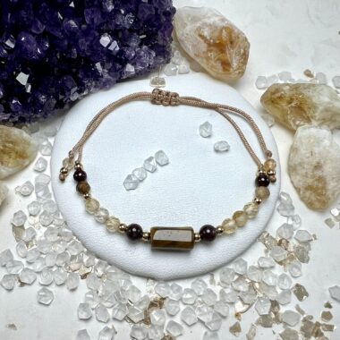 Bransoletka z Tygrysiego Oka Złotego, Granatu, Cytrynu i Agatu Beżowego z cylindrycznym kamieniem – dodaje odwagi, optymizmu i wewnętrznej siły.